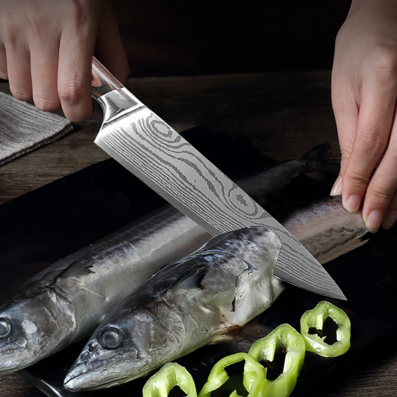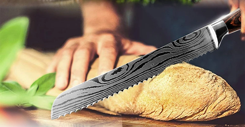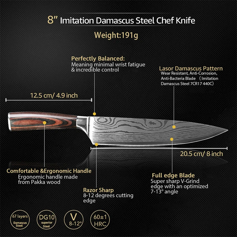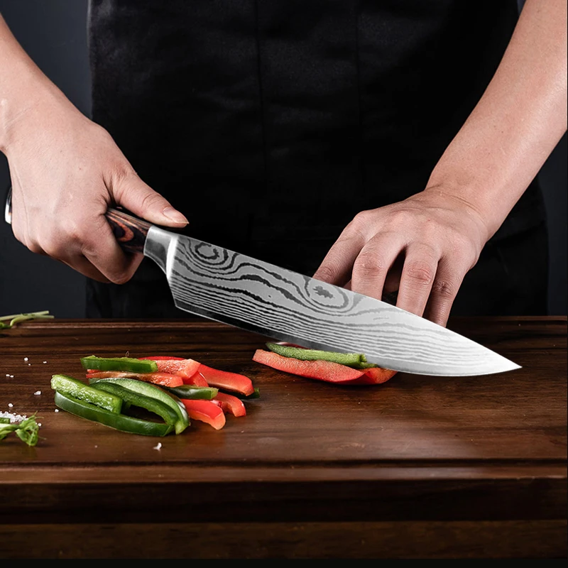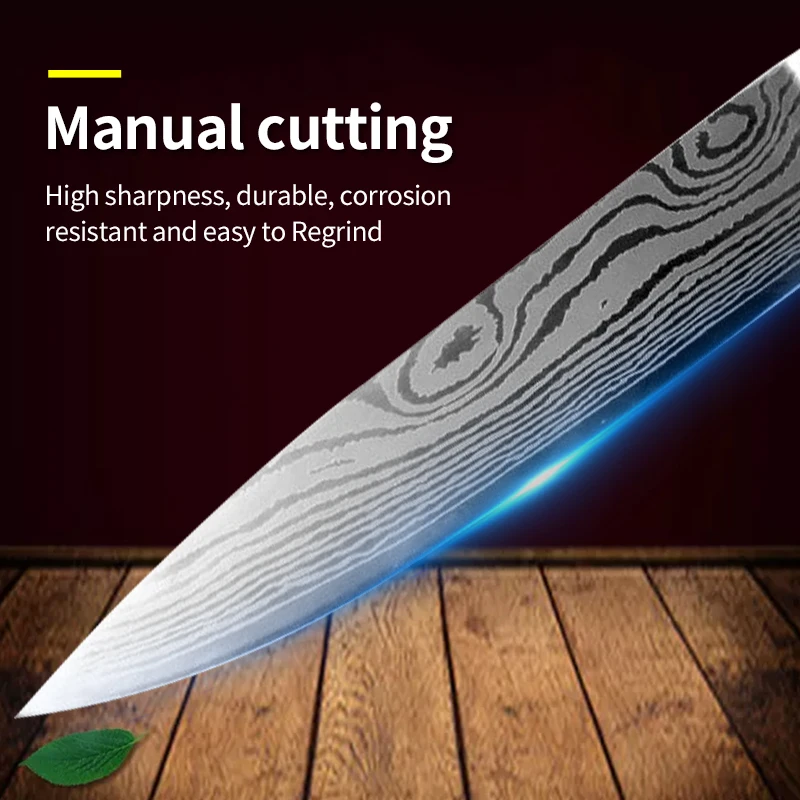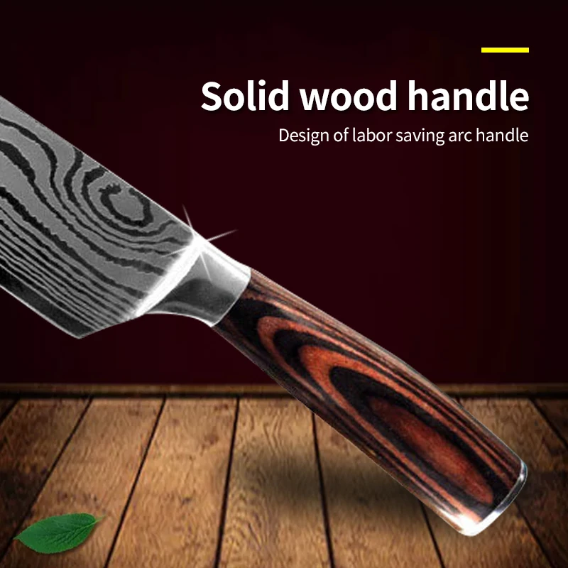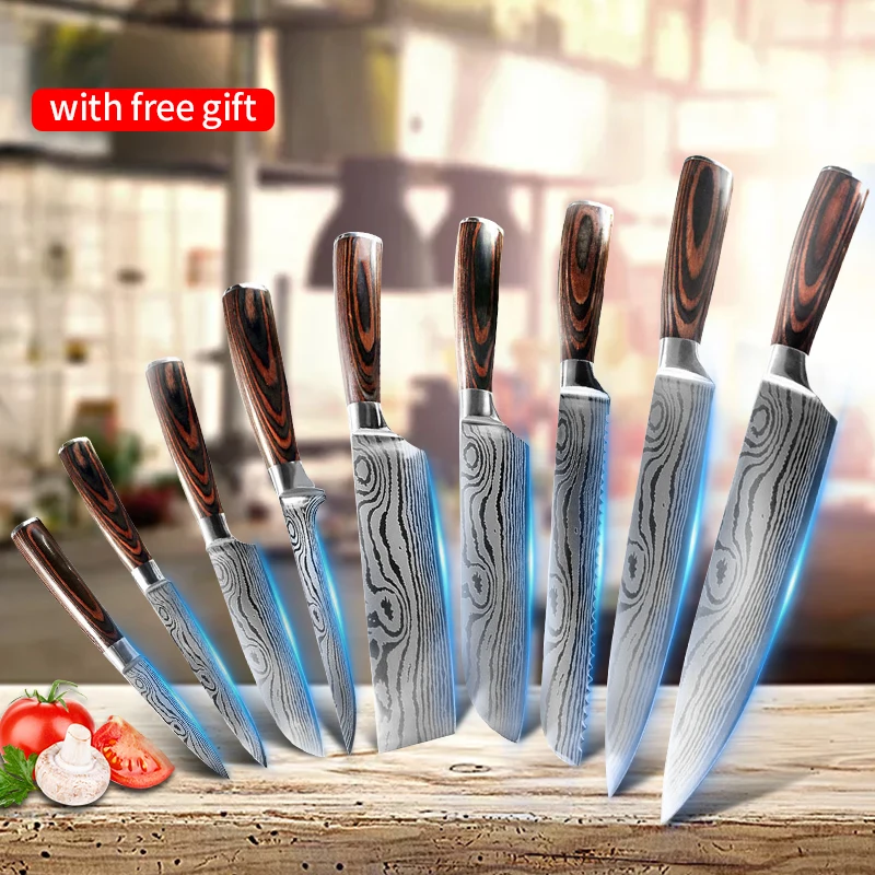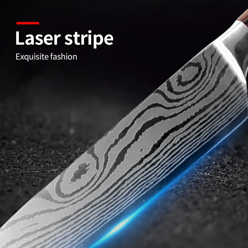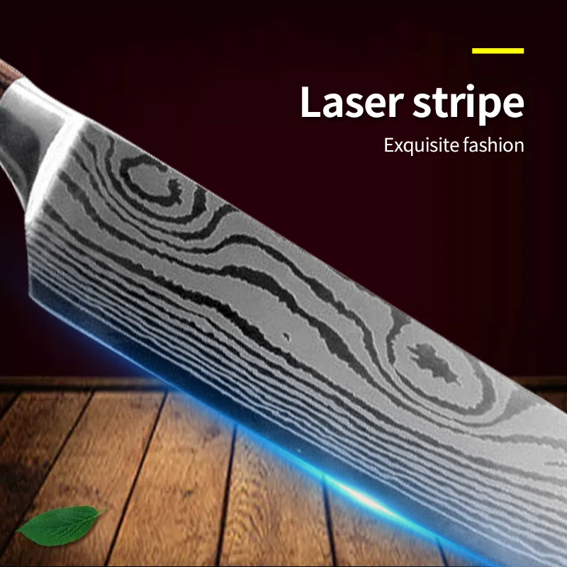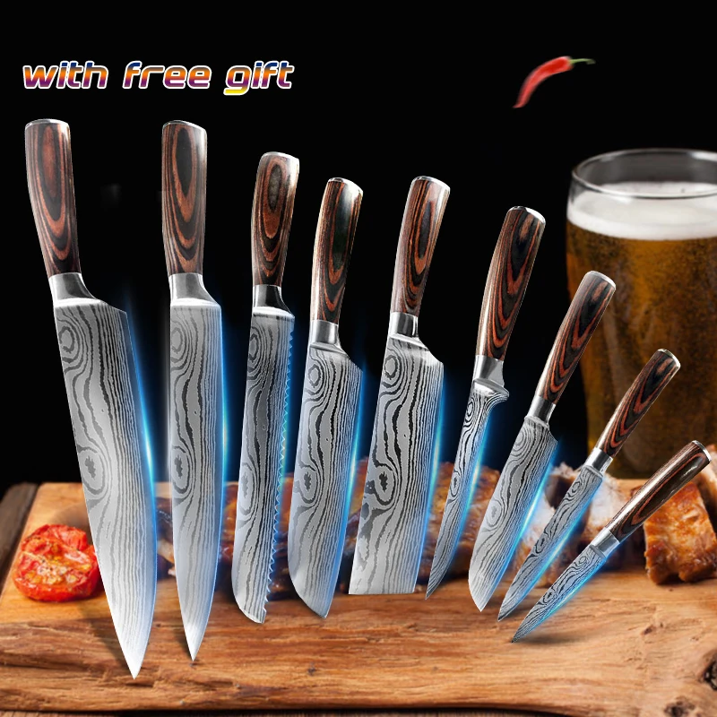 Набор профессиональных кухонных ножей шеф-повара, многофункциональный инструмент для приготовления пищи из дамасской стали с цветной деревянной ручкой и лазерным узором