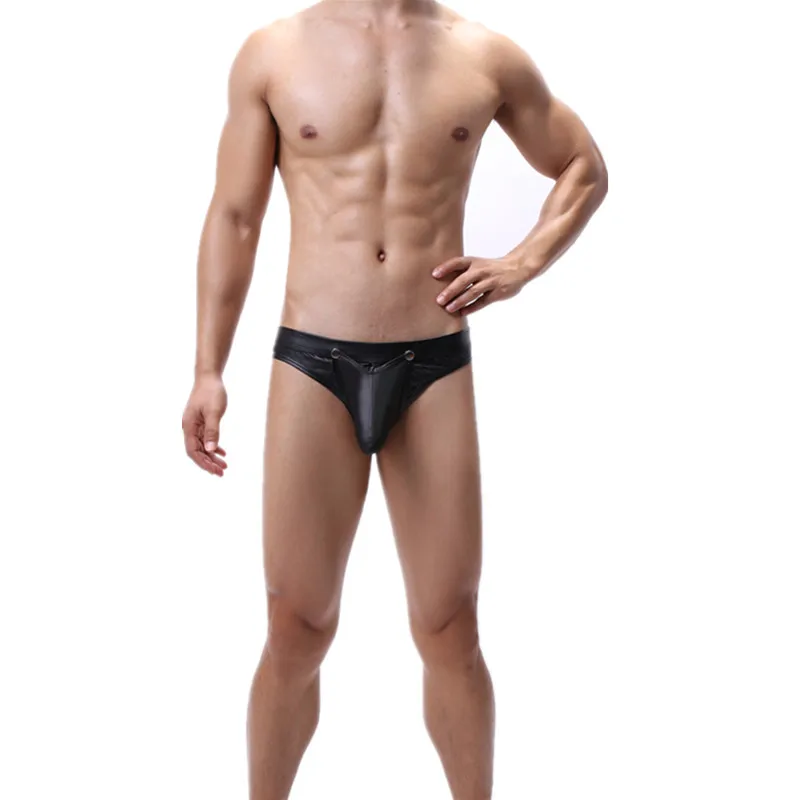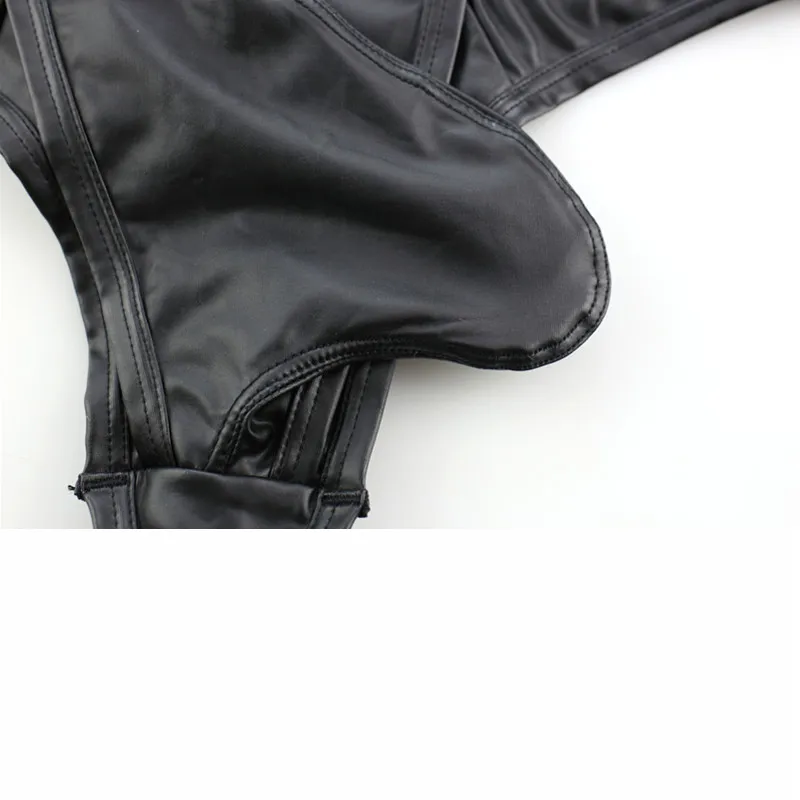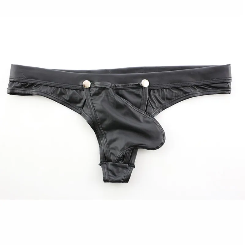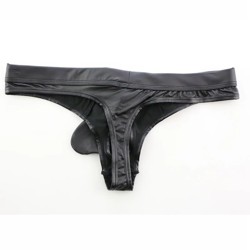Сексуальное нижнее белье для геев, мужские стринги, черные, искусственная кожа, t-трусики, мужское нижнее белье, бикини с низкой посадкой, съемный мешочек, эротический пенис, cueca S-XL