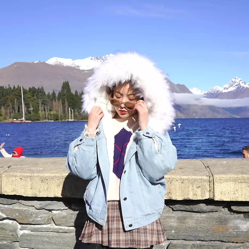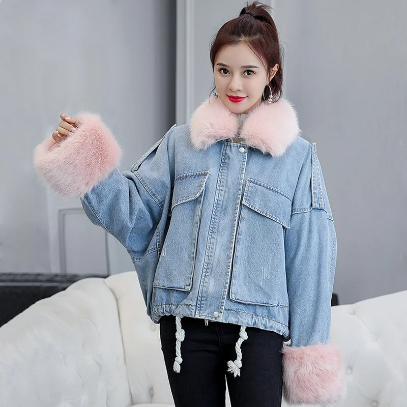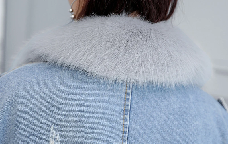 Белый 2019 Сумки из натуральной кожи, зимняя джинсовая куртка для женщин мягкий меховой подстежкой джинсовая куртка меховой воротник верхняя одежда в винтажном стиле размера плюс свободные толстое теплое джинсовое пальто