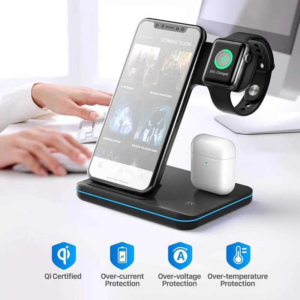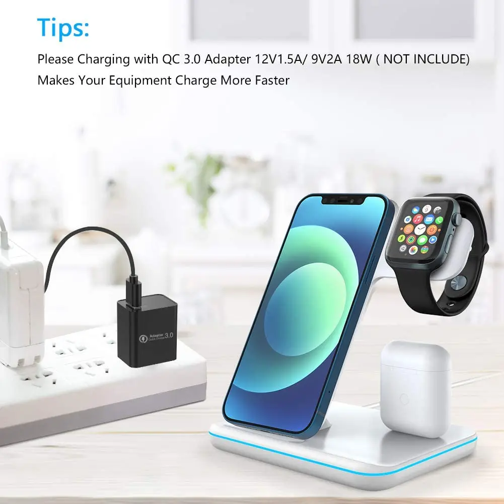 【 3 в 1 Беспроводное зарядное устройство3 в 1 беспроводная зарядная станция может заряжать для телефона/Apple Watch series 7/SE/6/5/4/3/2AirPods в одно и то же время, многофункциональный дизайн обеспечивает аккуратную зарядную подставку. Беспроводное зарядное устройство 3 в 1 требует только 1 зарядный кабель сделает вашу комнату или стол более простым и аккуратным, так что ваша жизнь будет более удобной.