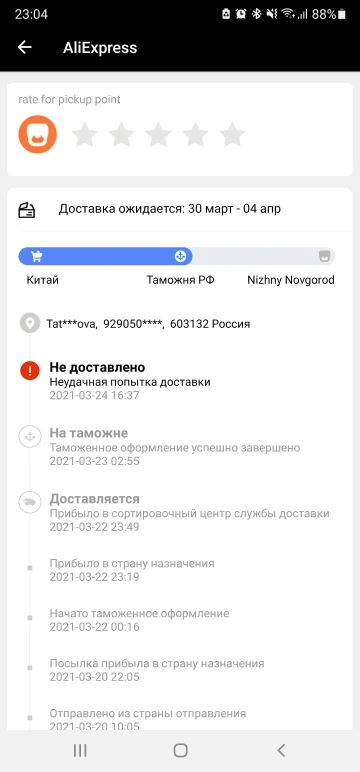 товар я таки получила, ура, но доставка и общение весёлое. при оформлении заказа заполнила паспортные данные, Инн, все ок, на разтоможке сначала забраковали , потом растоможили, все хорошо, но почему-то "неудачная попытка доставки ". Не понимаю, что происходит, описываю все продавцу, на что идёт ответ "чем могу помочь ", да я как бы описала всю проблему, почему доставка не доставляется? пытаюсь открыть спор, а али отвечает "вы не можете открыть спор, тк сначала продавец должен отправить товар". так он ещё и не отправлен??? вопросов больше чем ответов. общение с продавцом- как будто с роботом у которого только одна фраза в наличии