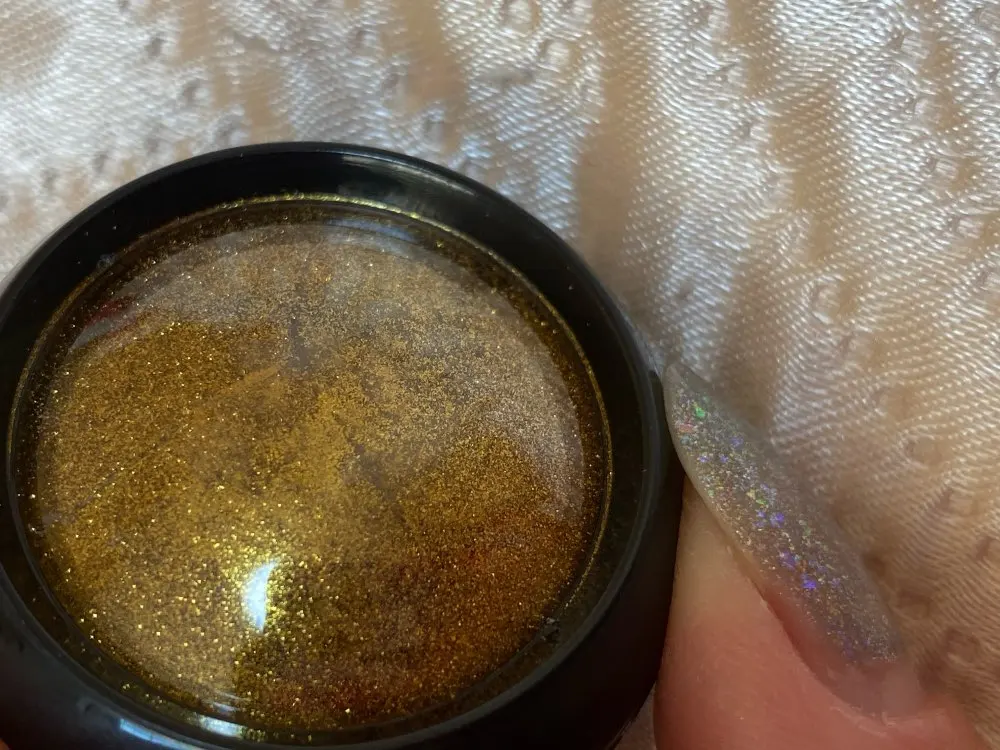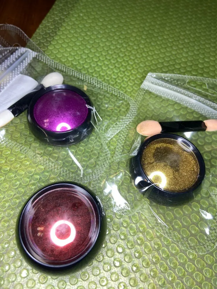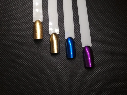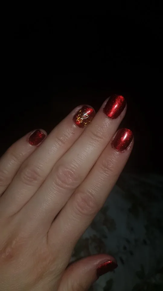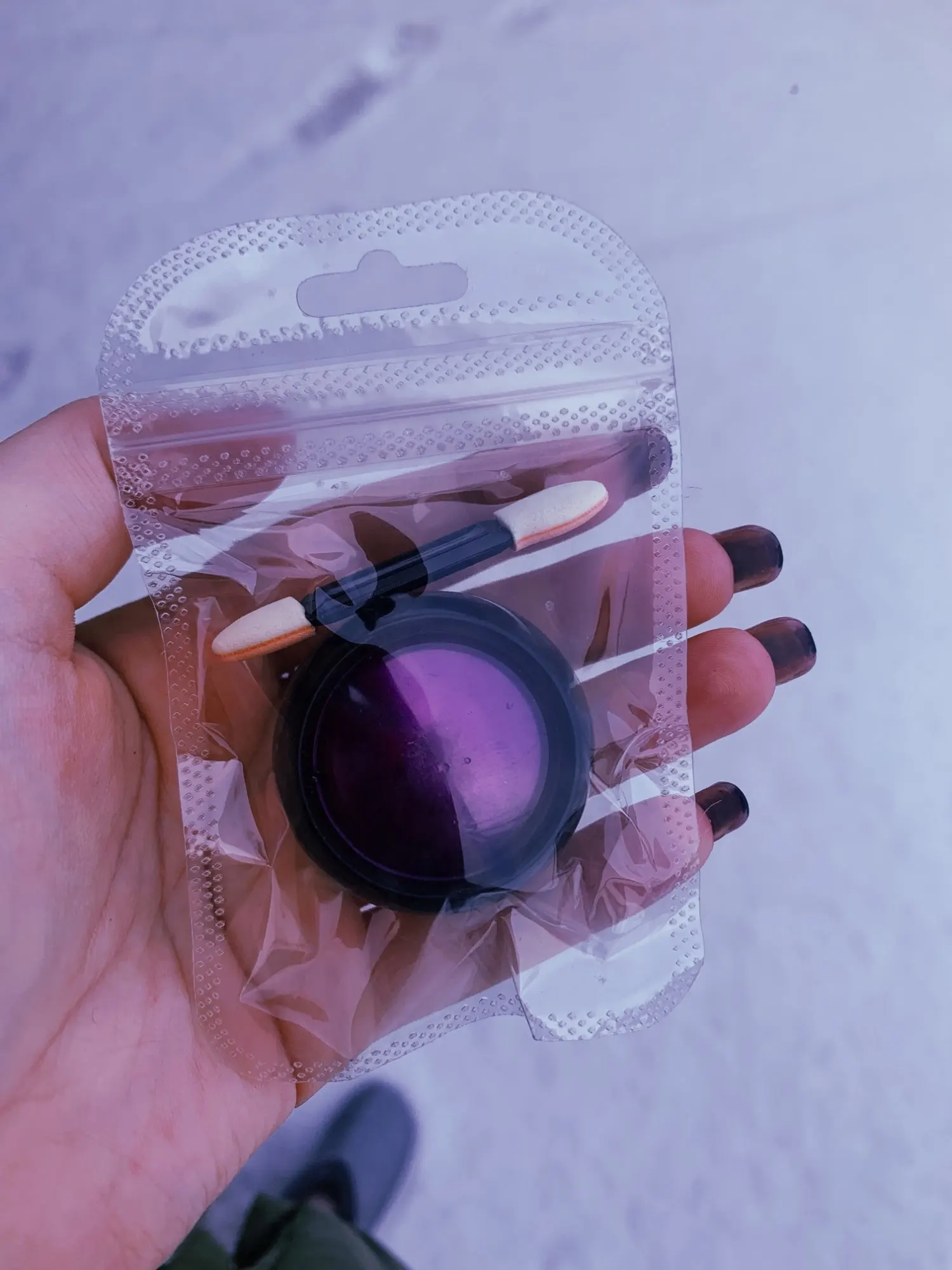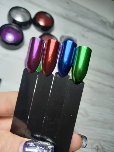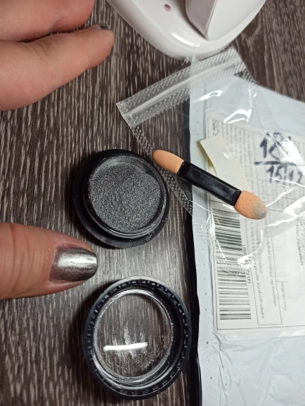 посылка шла 2 месяца,втирка норм,но заполняемость на половину,хотя втирка была запечатана,ей никто до этого не пользовался,цвет красивый,но у меня почему-то зеркальный эффект не получился,как на фото продавца,втирала в два слоя на бесцветную базу слипким слоем,сверху топ без липкого слоя.