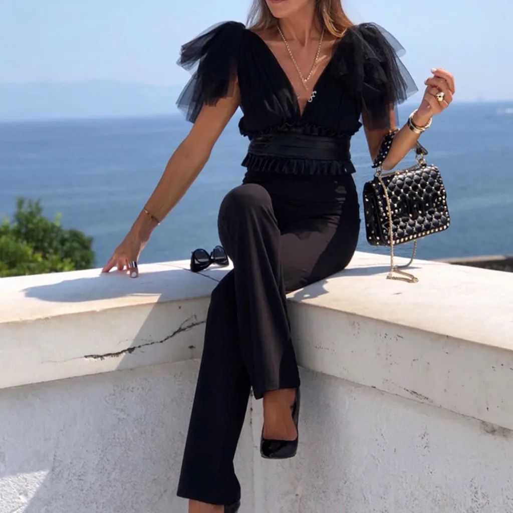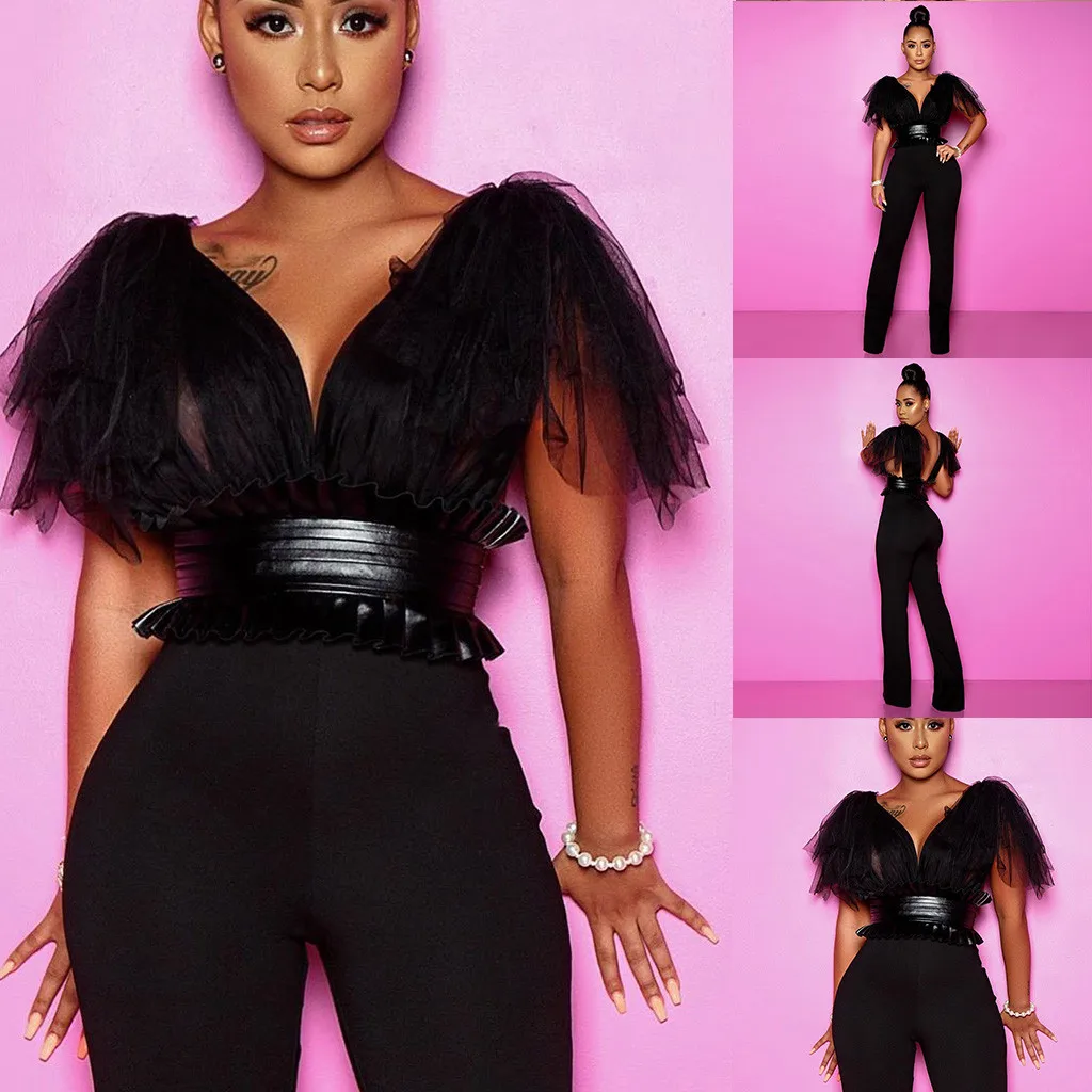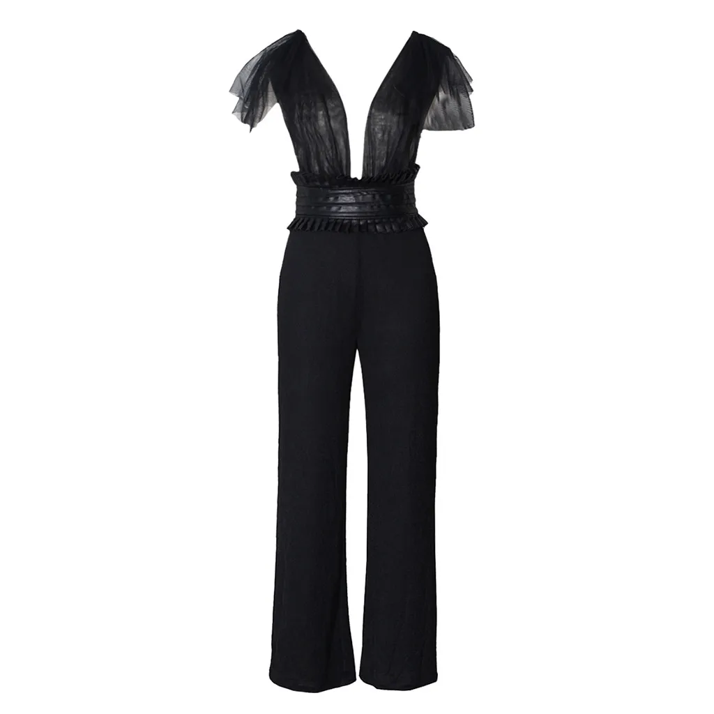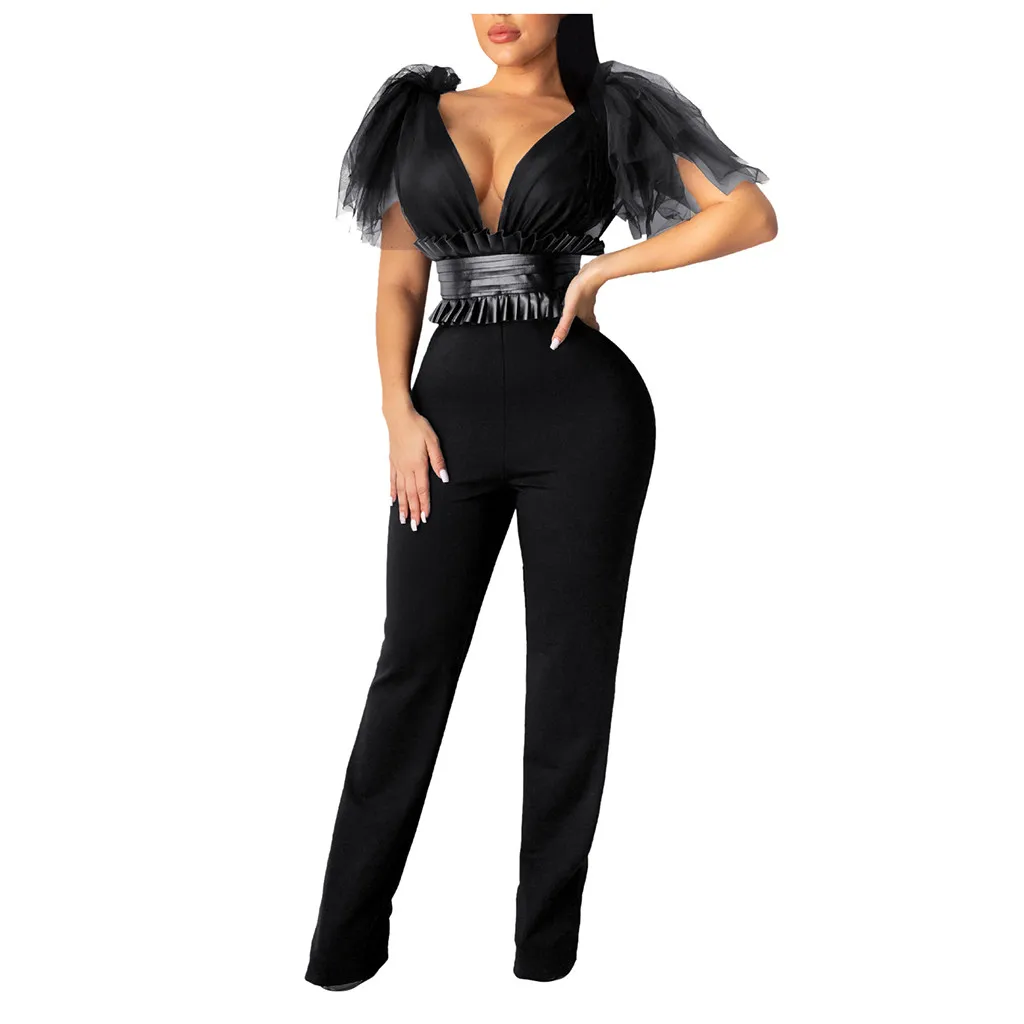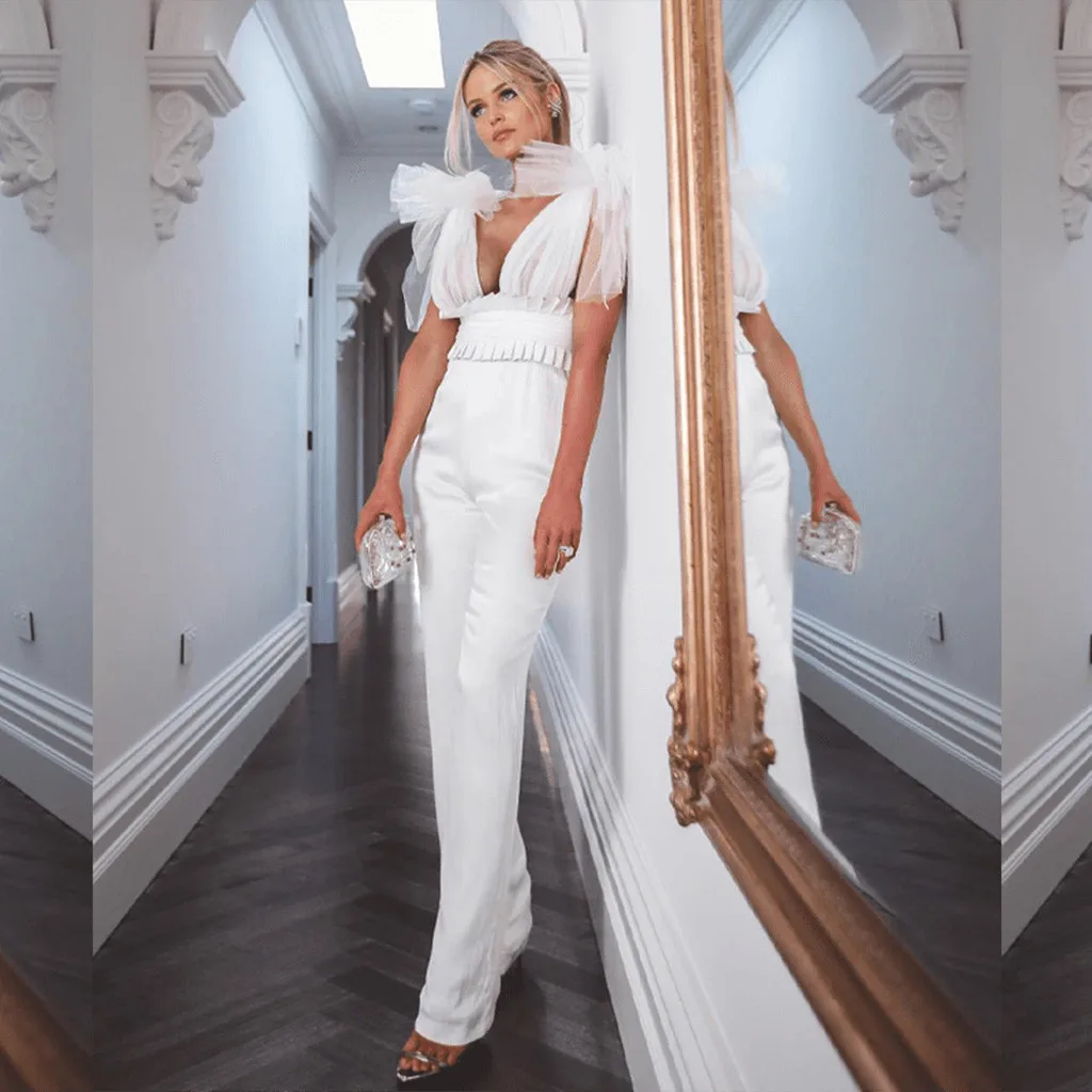 Женский Модный повседневный комбинезон с V-образным вырезом, однотонный сетчатый комбинезон с бантом, праздничные комбинезоны