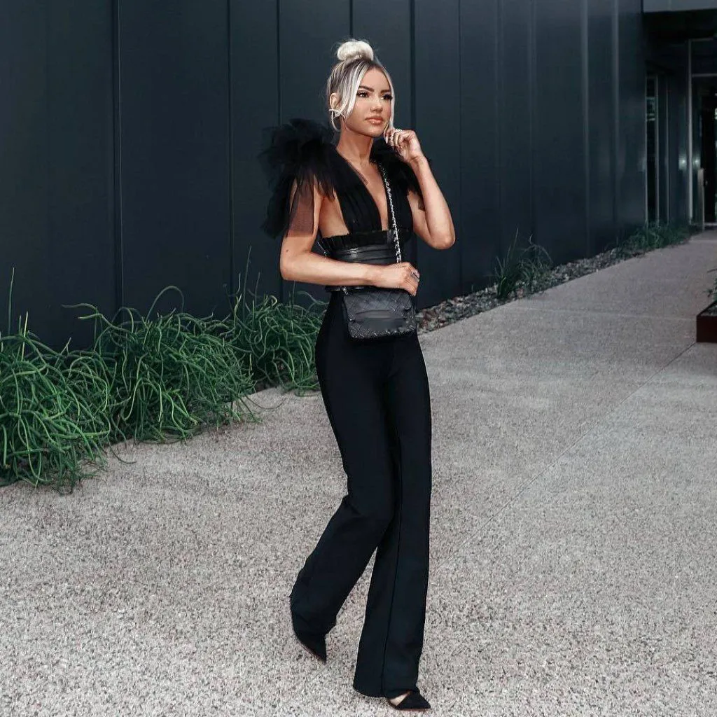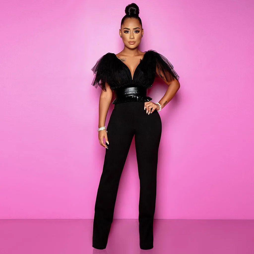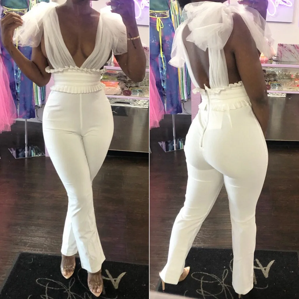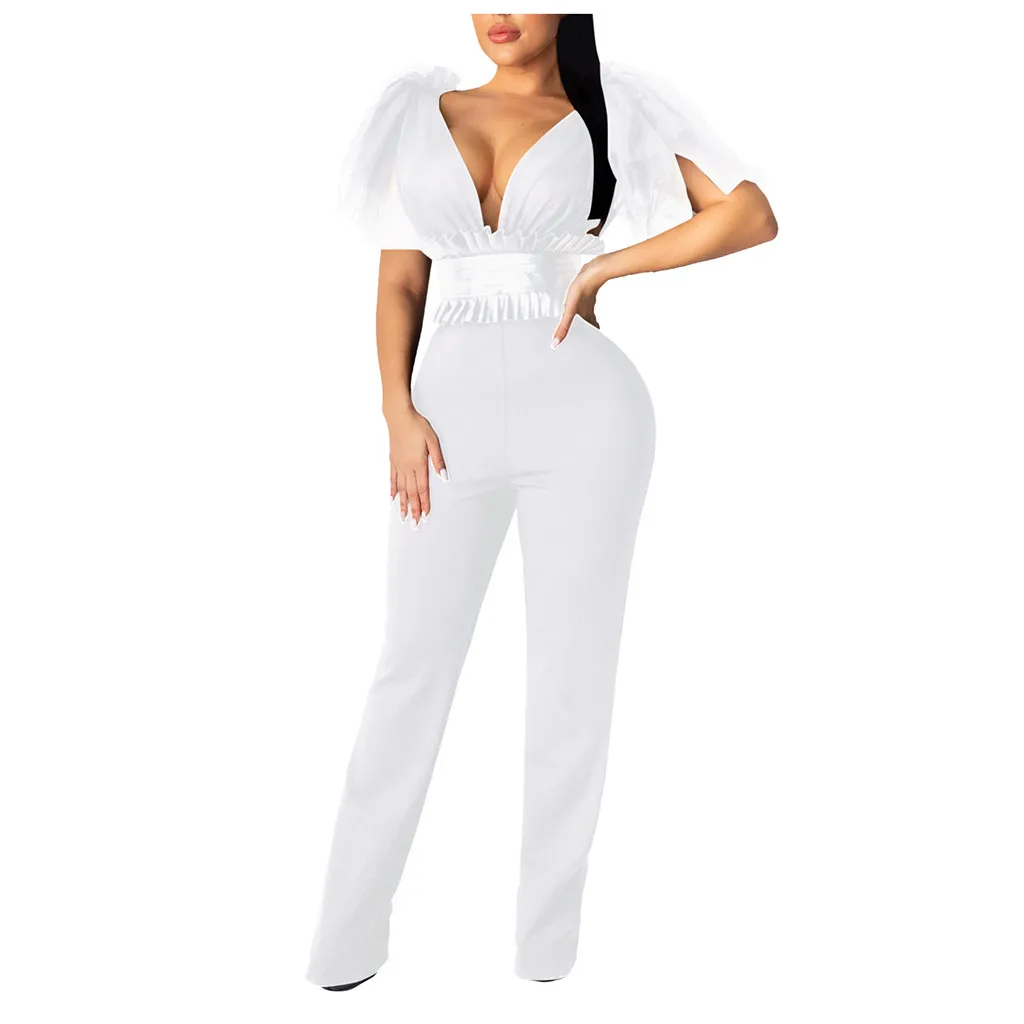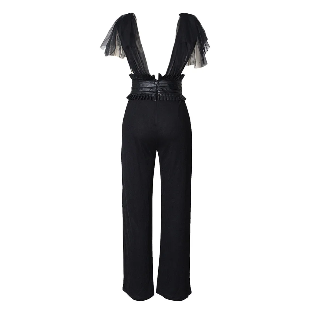 Женский Модный повседневный комбинезон с V-образным вырезом, однотонный сетчатый комбинезон с бантом, праздничные комбинезоны