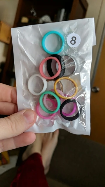 В Новосибирск пришли довольно быстро. Взялся под серебро. Смотрятся красиво, ярко. На одном колечке заметен шовчик, на другом нет. 6 и 7 размер очень мало отличаются по диаметру, я бы сказала, ничтожно мало. Есть ощущение, что силикон покрашен сверху, сотрется со временем. Носить широкое силиконовое кольцо оказалось удобнее, чем тонкое.