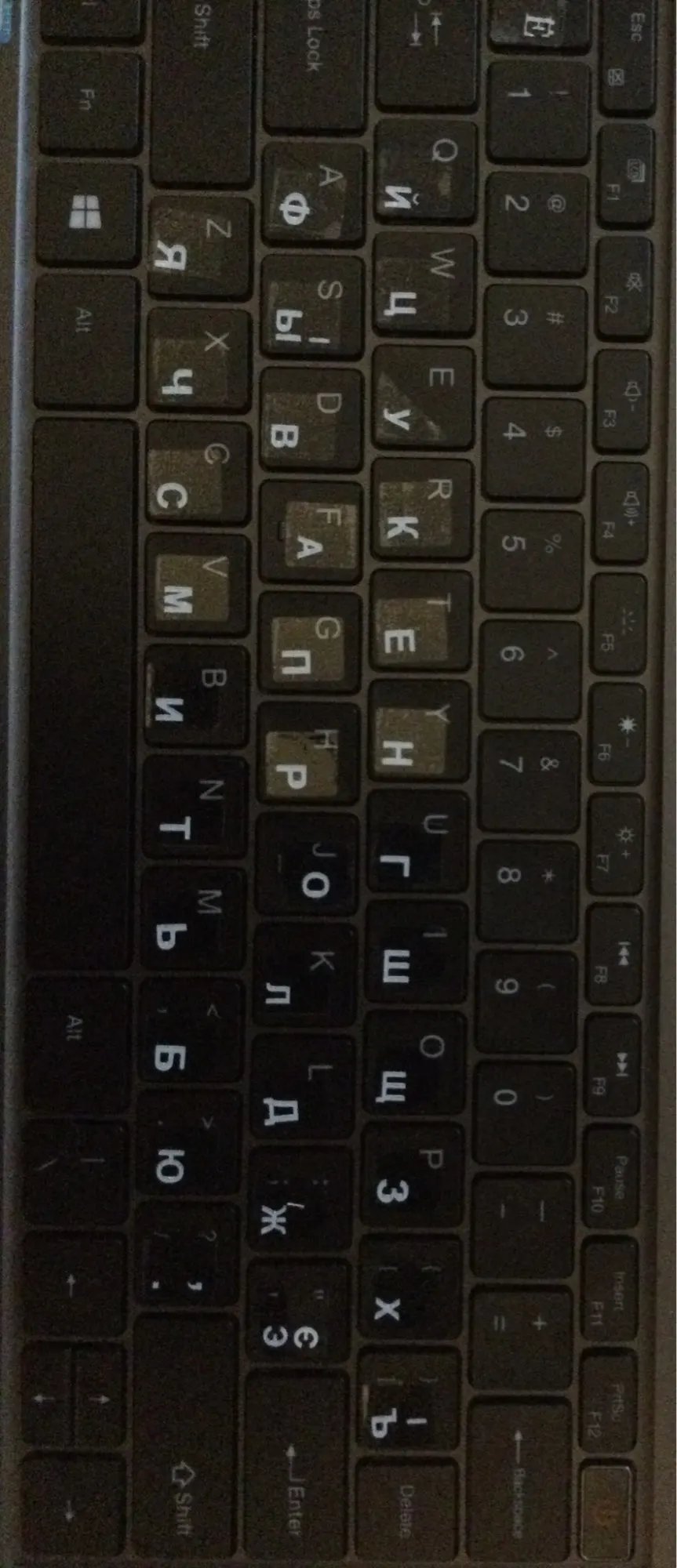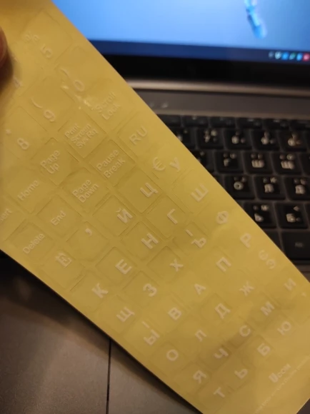 наклейки вполне хорошие. видны на чёрной клавиатуре, на ощупь приятные, пока не отклеиваются. из минусов лишь то, что есть около пятнадцати совершенно бесполезных наклеек, а те, что с цифрами, пришлось аккуратно обрезать, чтобы оставались лишь нужные символы. так же наклейки гораздо меньше клавиш, но я это особо за минус не считаю. не хватает символа /. в остальном всё отлично.
