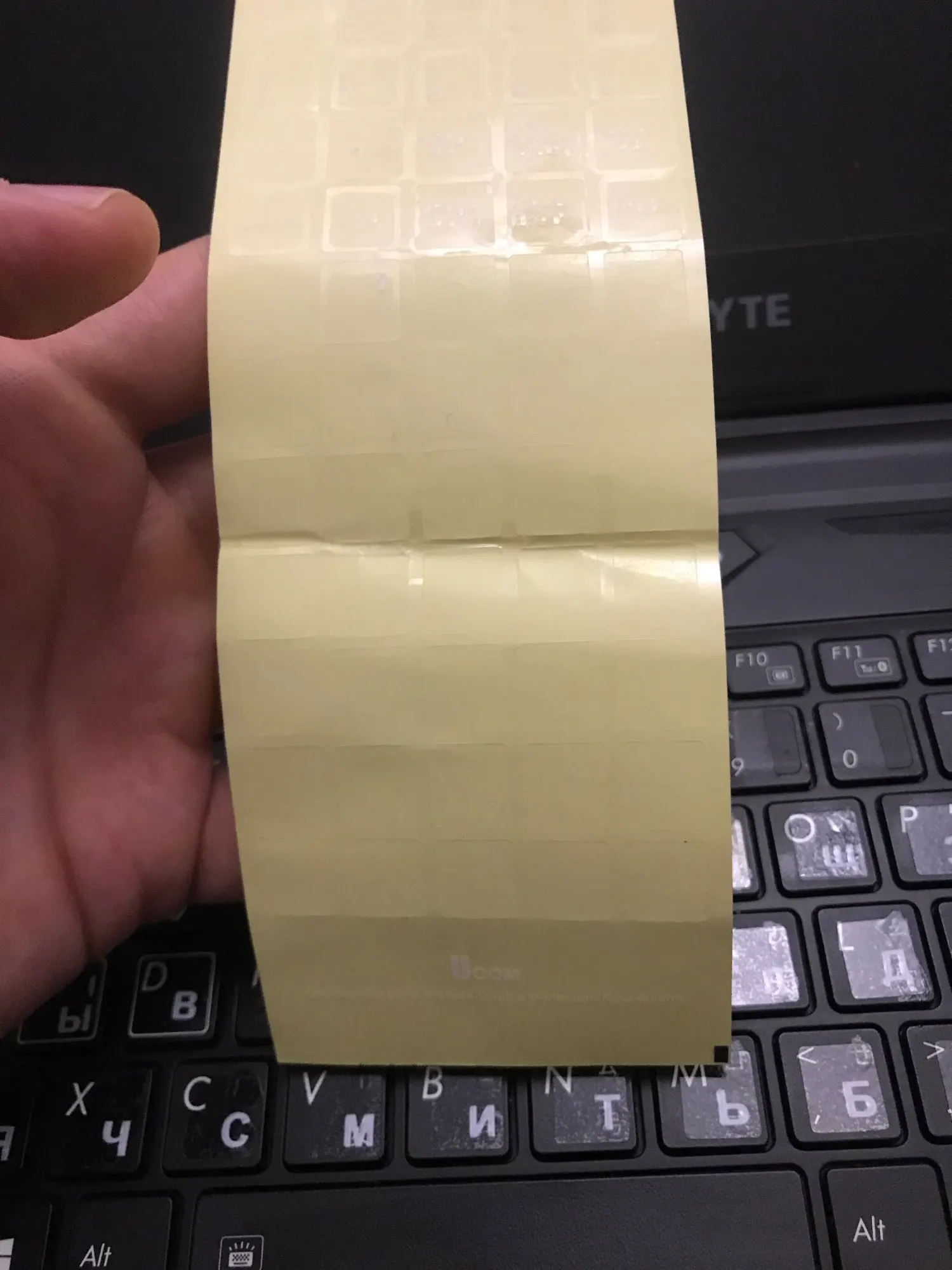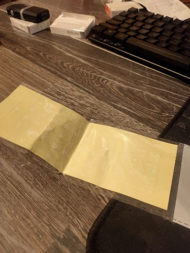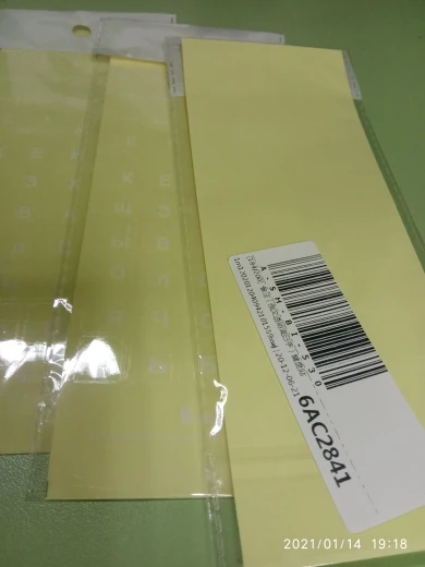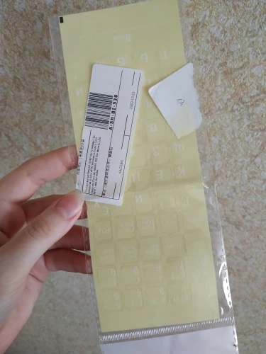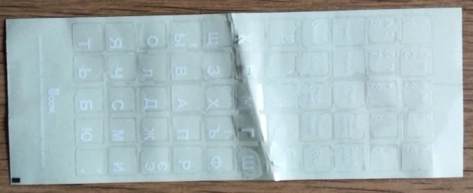 Товар отправлен на 4 день. Полная доставка за 25 дней. Качество соответствует цене: плёнка толстая и мутноватая. Клейкая основа так себе. Полоса была неаккуратно сложена пополам и часть наклеек была помята. Полностью к клавише не прилегали. ОбрезАл все наклейки по размеру символов и после этого наклеивал. Символы большие - для клавиатуры планшета и НБ меньше 14" великоваты.