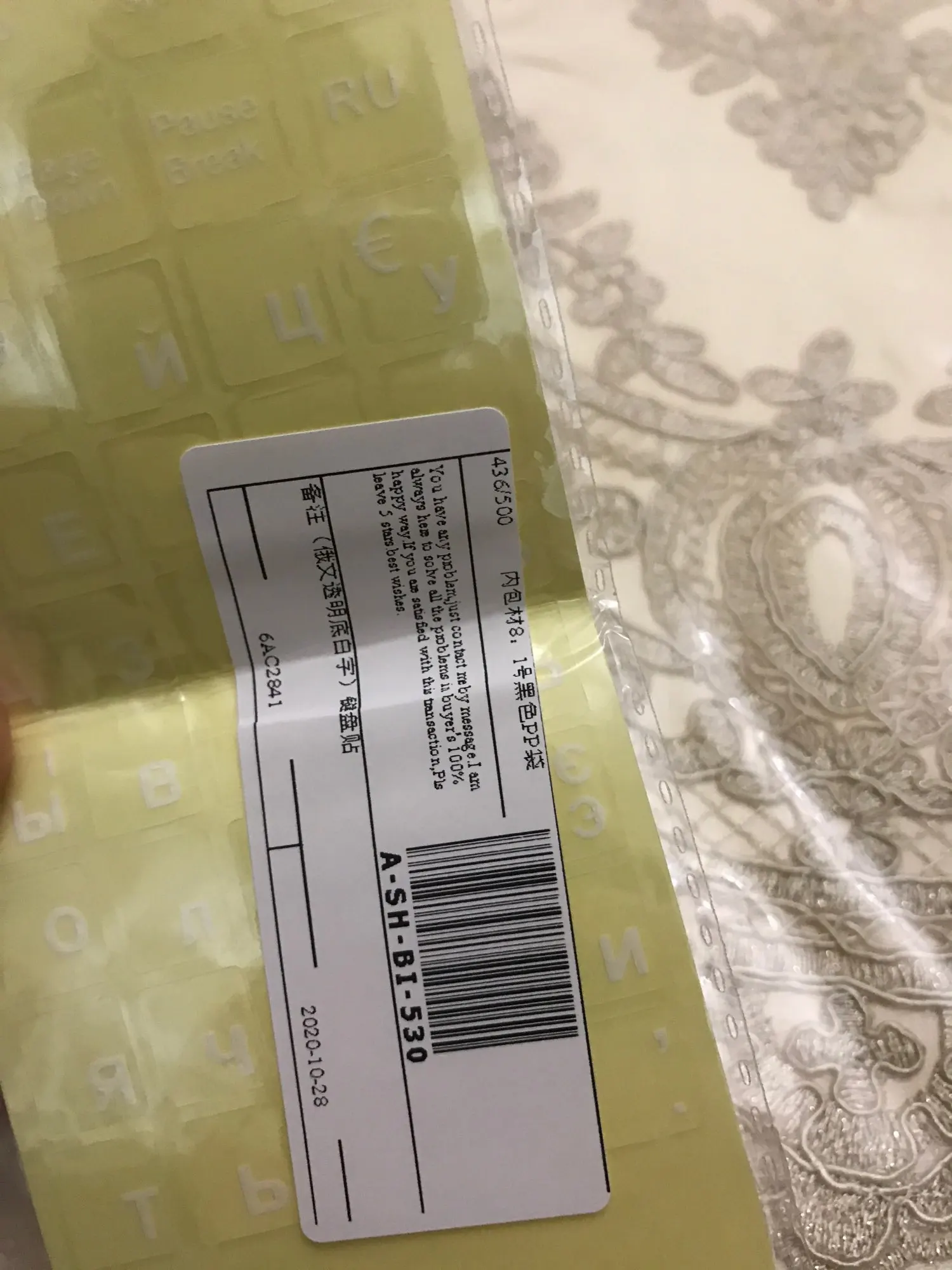 Товар шёл примерно 2 месяц, с момента заказа. Трек отслеживался усеченной версией только через Aliexpress с задержкой. Товар приехал в целости и сохранности, правда долго растамаживался. Товар соответствует описанию. Лист с наклейками, продавец положил в зип-конверт во всю длину не сгибая, и далее в плотный почтовый серый пакетик. Буквы белые на плотной прозрачной подложке, смотрится нормально, особенно при световой подсветке. Цена/качество соответствует! Магазин и продавца рекомендую.