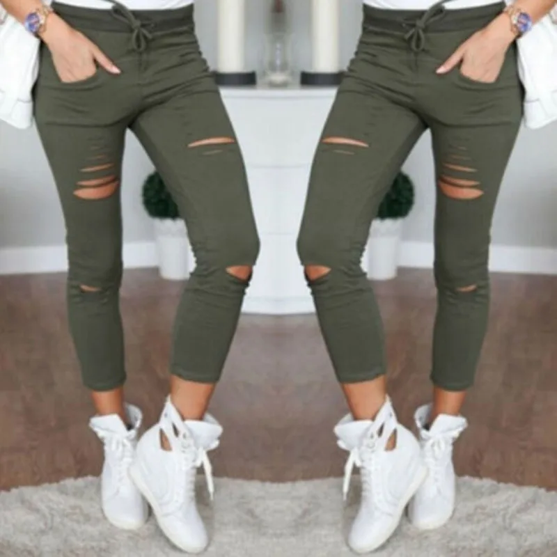 Для женщин Высокая Талия джинсовые Эластичные штаны Destroy узкий рваные потертые зауженные Длина брюки армейский зеленый