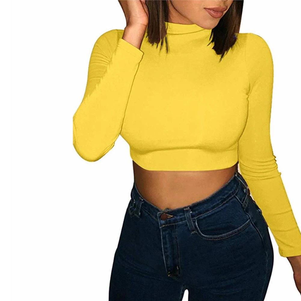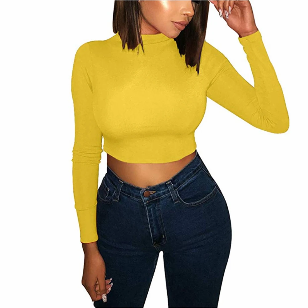 Модная женская однотонная облегающая Повседневная тонкая водолазка с длинным рукавом, осенние короткие топы