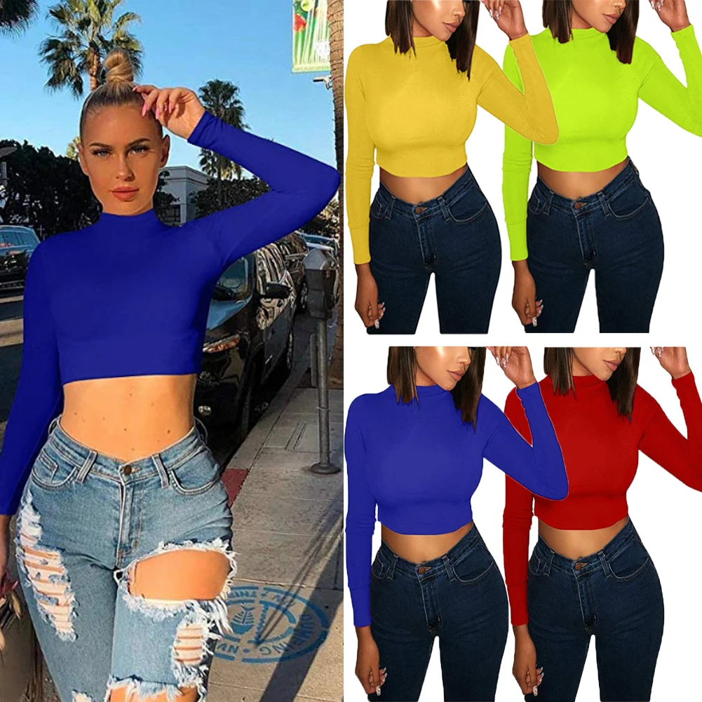 Женская облегающая футболка с высоким воротом, однотонный кроп-Топ ...