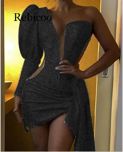 Женское блестящее серебристое вечернее клубное мини-платье, асимметричное облегающее платье с V-образным вырезом, сексуальное платье на одно плечо