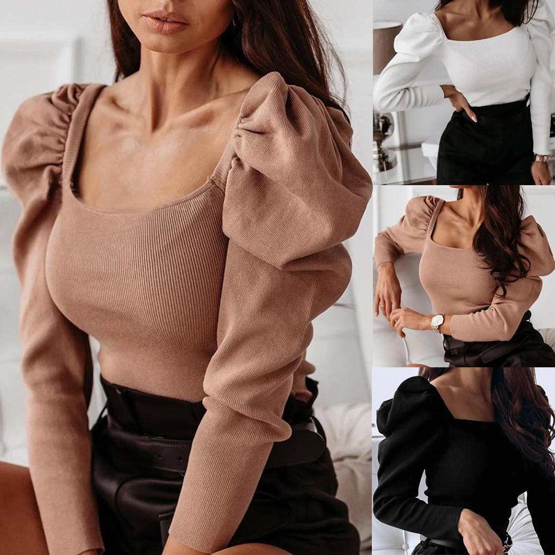 Женский Повседневный однотонный вязаный свитер с пышными длинными рукавами, Осенний джемпер, элегантная облегающая блузка с квадратным воротником, новинка 2020