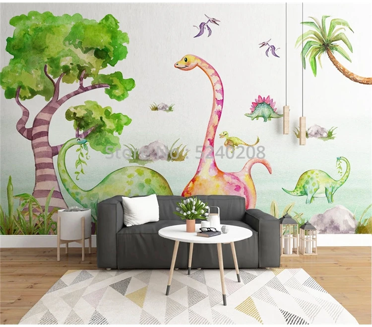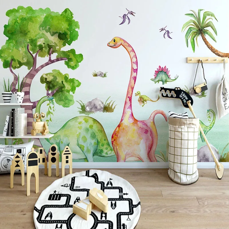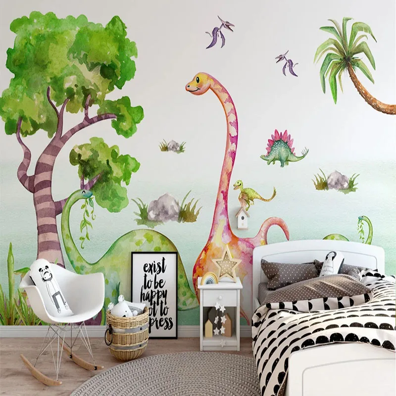 Самоклеящиеся обои на заказ, 3D Ручная роспись, мультяшный динозавр, животные, Тропическое дерево, фон для детской комнаты, наклейки