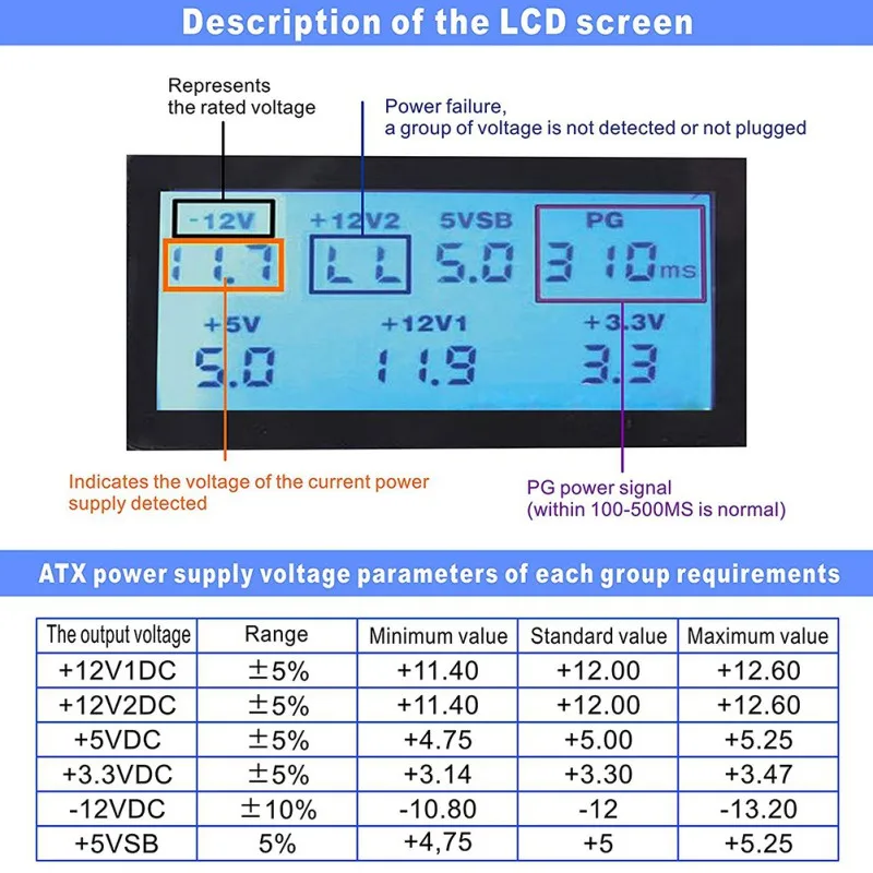 Особенность:1. С помощью этого тестера блока питания вы можете легко протестировать блок питания компьютера, чтобы избежать повреждения компьютерного оборудования. Батарея не требуется2. Совместим с блоком питания ATX, BTX, ITX3. Тестер мощности является идеальным инструментом для всех специалистов по техническому обслуживанию компьютера4. Тестер мощности ATX выводит уровень напряжения разъема на 1,8 дюймовый встроенный экран устройства! Вы можете точно обнаружить проблемы с питанием и предотвратить повреждение системной платы5. Может быть протестирован 20, 24, 4-контактный разъем питания, SATA, гибкий разъем питания, PCI-E, 4-контактный, ATX12V и 8-контактный разъемы6. Это новый источник питания. Тестер может проверить 8-контактный процессор, PCI Express и SATA.7. Этот тестер оснащен 20-24-контактным разъемом источника напряжения. А 1,8 дюймовый экран подсказывает вам выходное напряжение разъема8. Имеет функцию источника напряжения 20/24-контактные разъемы9. Имеется оповещение о неисправности, и доступен тестовый интерфейс, а также небольшой и красивый дизайн, тестовые функции и т. д. это лучший выбор для быстрого обнаружения источника питания ПК10. Тестер мощности может просто и интуитивно понимать, проверяя источник питания, вставив блок питания разъем ATX, и самый яркий выход является нормальным. Тестер мощности представляет собой мощное оборудование для тестирования мощности, которое может обнаруживать ATX, BTX, ITX, TFX компьютерный источник питания, ЖК-Напряжение каждой группы и PG значение блока питания компьютера PG, чтобы облегчить быстрое обнаружение прибораСпецификация:Источник напряжения: 20/24pin(ATX-разъем)Тест напряжения: плюс 3,3 В, плюс 5 В, плюс VSB, плюс 12 ВРазмер: 4,75x2,5 "/12,07 x 6.35смЦвет: черныйУпаковка: блистерная упаковкаВ комплект входит:1 x Цифровой тестер блока питания1 x ИнструкцияПримечание:Из-за разницы в экране цвет может немного отличаться от того, что вы ожидаете, пожалуйста, учитывайте это