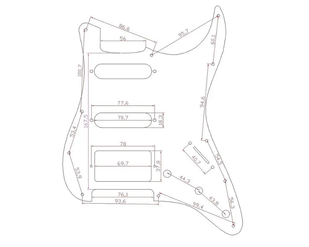 2 одиночных катушки и 1 мост humbucker рутины. Слот Humbucker имеет радиусную угловую форму, поэтому вам не нужно кольцо для пикапа для этого пикапа, подойдет для большинства открытых пикапов