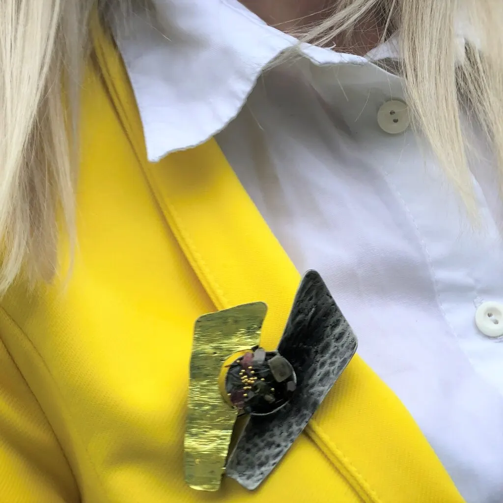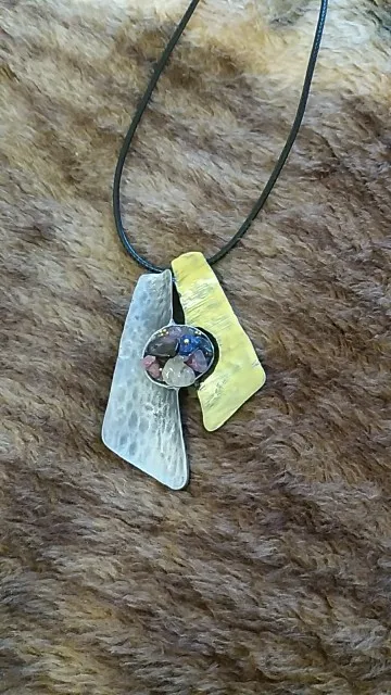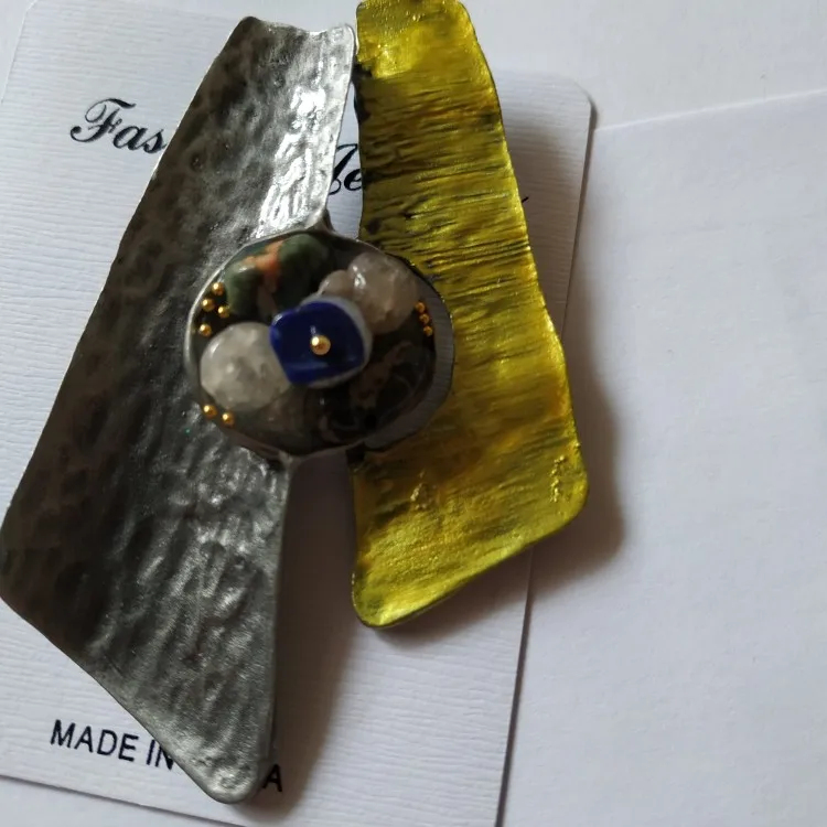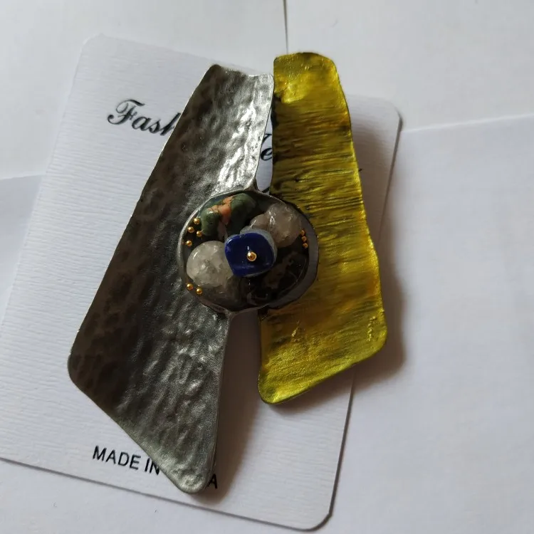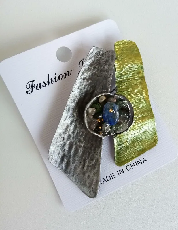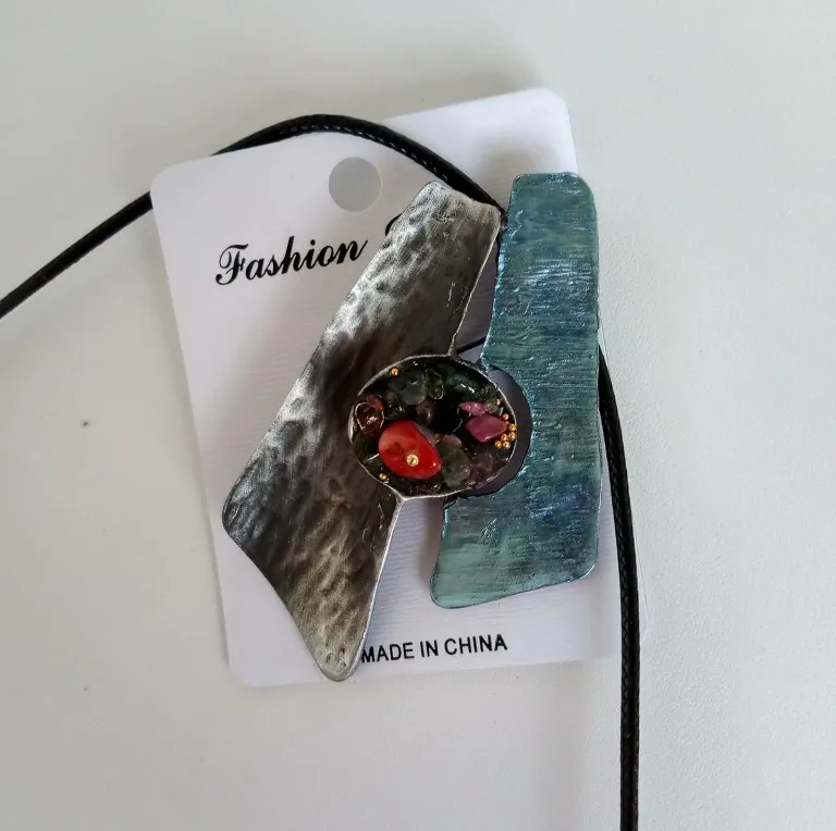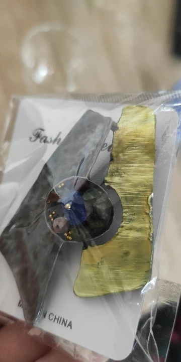брошь довольно крупная, сделана аккуратно, две железные пластинки, внутри наклеены камешки. все на месте без повреждений. можно носить как брошь, а можно на шнурке. смотрится стильно. продавец отправил заказ очень быстро. рекомендую.