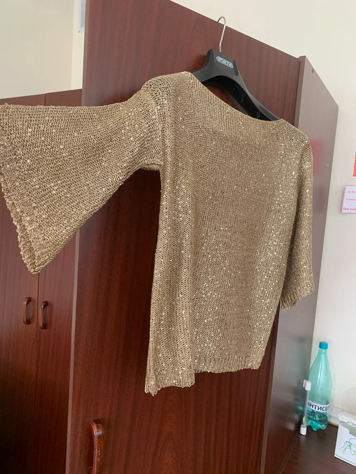 Блуза отличная. Как на фото. На российский размер до 48. Немного колятся пайетки на швах рукавов. Попробую подрезать с внутренней стороны....Смотрится нарядно и дорого. Может ещё черную закажу.