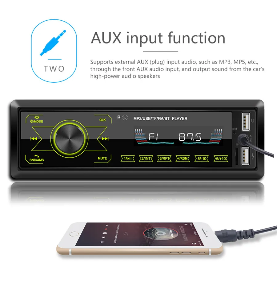 Особенности:1. Радио2. Поддержка чтения карт памяти и U дисков (аудио)3. Функция AUX-in4. Функция Bluetooth (ответ/телефонные вызовы, Bluetooth музыка)5. Аудиовыход RCA6. Сенсорные кнопки7. С usb-портом для зарядки телефонов8. Яркие огниТехнические характеристики:Напряжение: 12 в пост. ТокаЭкран: ЖК-дисплейСенсорный экран: нетКнопочный светильник: цветной сенсорный светильник sЗарядка телефона: ПоддержкаРадио чип: QN8035Видеовыход: не поддерживаетсяВерсия Bluetooth: 4,0Радиочастота: FM 87,5 ~ 108 МГцКнопка: сенсорные кнопкиИнтерфейс USB и количество: 2 порта (USB 1: чтение музыки на u-диске; USB 2: Зарядка мобильных телефонов)Оригинальное управление на рулевое колесо автомобиля: нетВнешний вход спереди: поддерживаетсяРегулятор громкости: ПоддержкаПоддерживаемые Аудиоформаты: MP3, WMA, WAV, FLACПримечания:1. Возможны незначительные отклонения в размере из-за ручного измерения, различных способа измерения и инструментов.2. Изображение может не отображать фактический цвет товара из-за различного фотографического светильник, угол и монитор экрана. Упаковка pureglas1 шт. головное устройство2 X Кабель Питания1 X пульт дистанционного управления2 ключа разборки1 X Руководство по эксплуатации