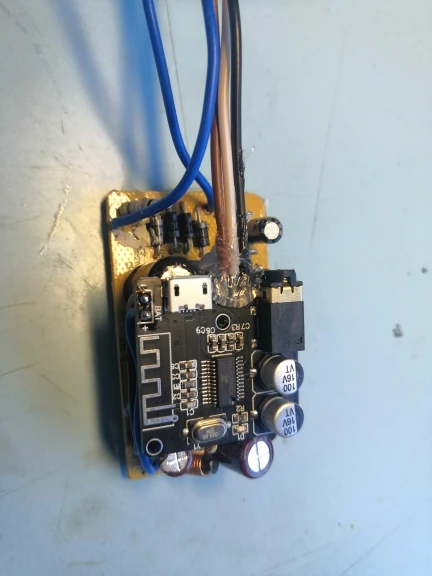 Недорогой приёмник синезуба с стереоотводами на нагрузку (RGL), линейным входом(?) и microUSB для подзарядки батареи (на контакты BAT+-). Это плата для наушников, как я понял, без регулировки громкости, кварц на 24кгц и чипом (на фото с увеличением).