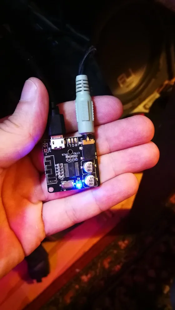 Офигенная вещь! Цепляется без всяких паролей в течение секунды. Дал новую жизнь аудиоколонкам. Впаял на имеющиеся контакты (помимо разъёмов) провода от питания усилителя и входа колонок. Разместил внутри корпуса. Ловит по всей квартире. Не шумит. Включаешь bluetooth на телефоне и в течении секунды безпарольное соединение. Далее включаешь плейер и все!