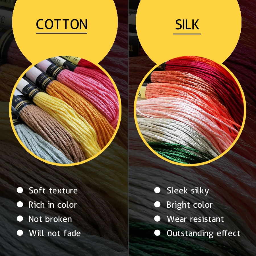 Среди наших изделий с вышивкой крестиком хлопковая нить изготовлена из натурального хлопка, произведенного в Китае, и цвет теплый и мягкий; шелковая нить добавляется на основе хлопковой нити для увеличения процесса мерсеризации, что делает цвет нити более ярким и шелковистым, а блеск лучше. Шелк не очень Шелковый.