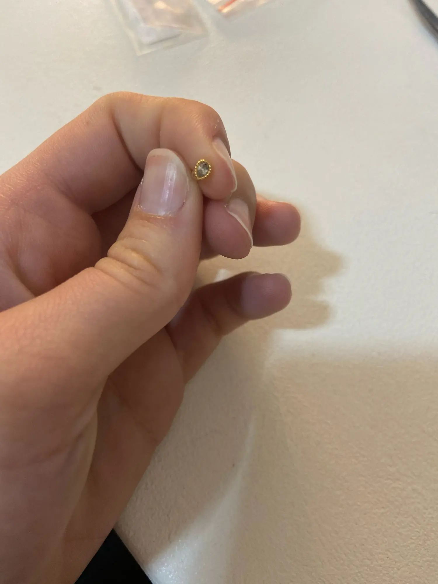 el tamaño del palito es demasiado grueso y duele al pasarlo por el agujero de la oreja ,es bonito pero solo sirve para alguien que se hizo el piercing con una aguja gruesa :(