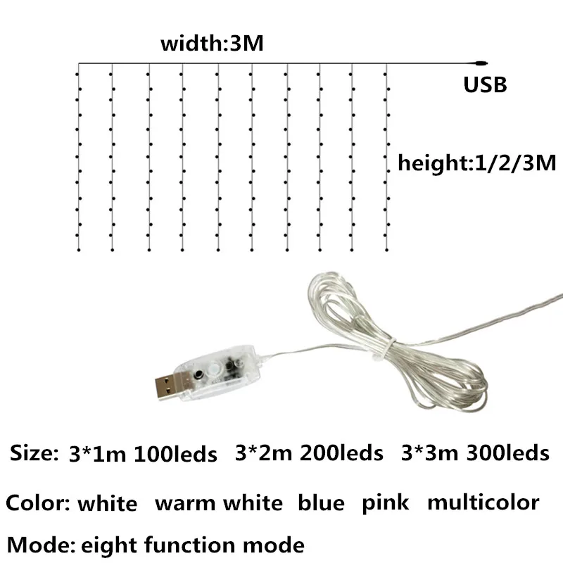 Гирлянда не 3*3, а 2.4*3, алиэкспрес вернула около 70%. А так гирлянда супер, кроме размера, все как в описании. Доставка очень быстрая.