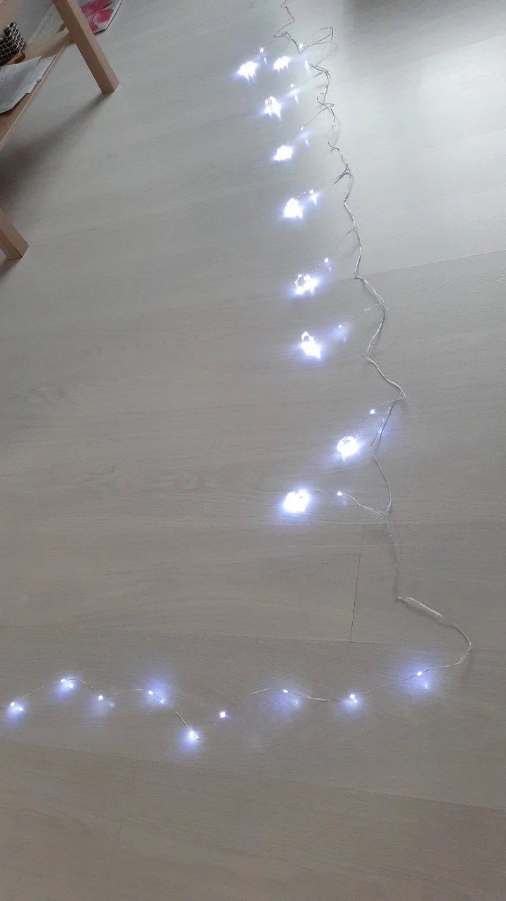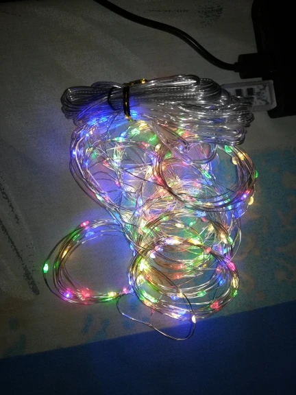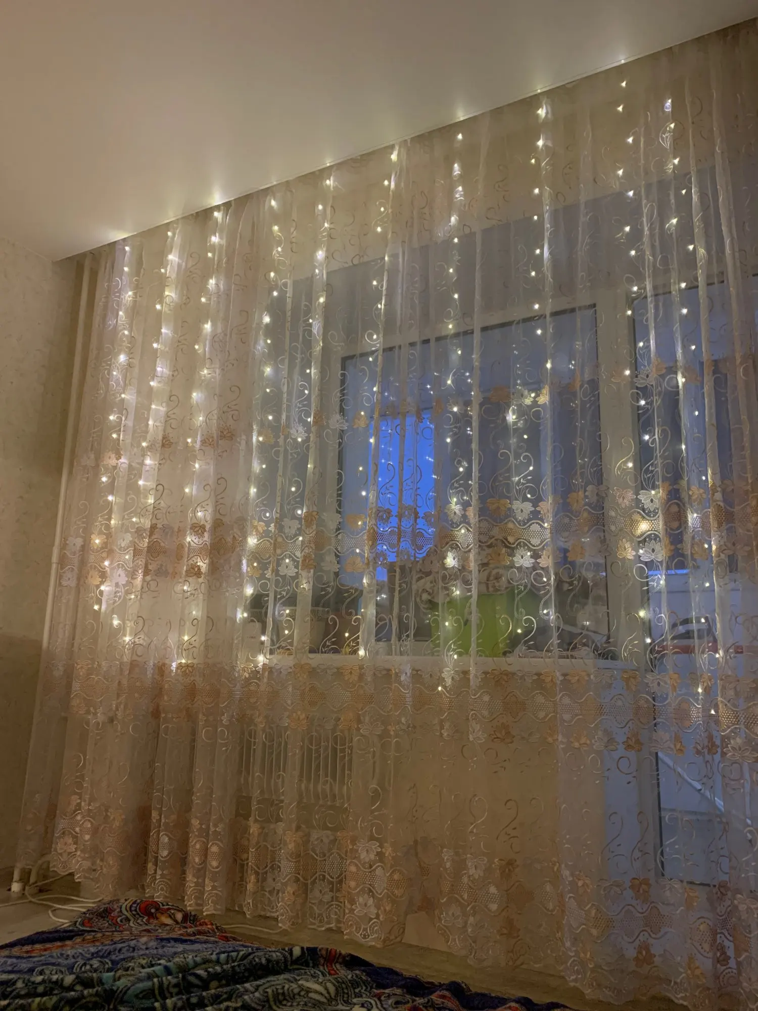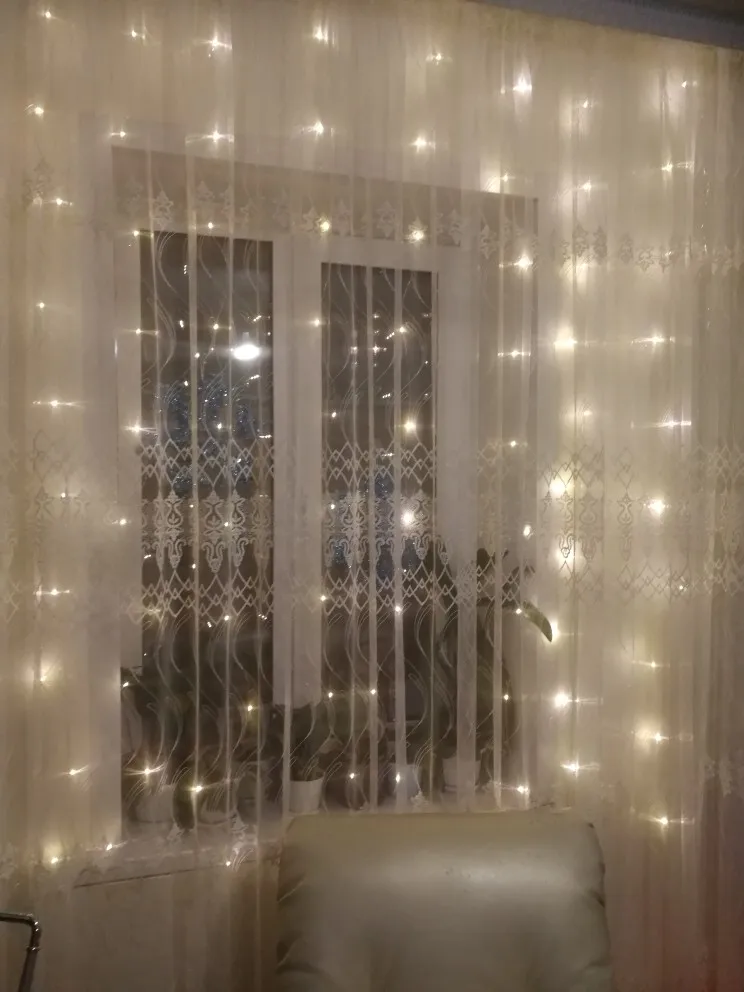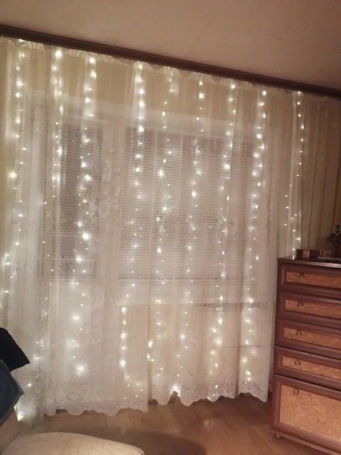 Фото, конечно, не передаёт всей красоты и уюта, которую создаёт эта гирлянда! Дошла за месяц до Омска, как и было написано, успела до нг. В следующем году планирую купить ещё такую в другом цвете в другую комнату. Всё работает и пульт и каждая лампочка, проводки тонкие, похожи на леску, поэтому, довольно прочные. Повешали на крючки от штор, пару нитей были очень запутаны, их припояли не той стороной, но минут 20 и получилась красота! У нас такие стоят раза в 2 минимум дороже. Так что, заказывайте смело, рекомендую!