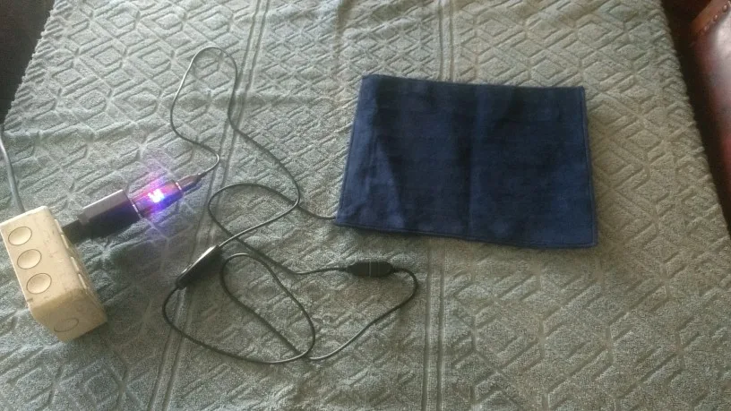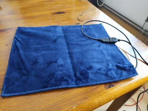 Nice and warm. The adjuster element is unreliable and useless though, best to remove it and throw it away. Without the adjuster, the blanked consumes 11.2W when plugged directly into a powerbank.