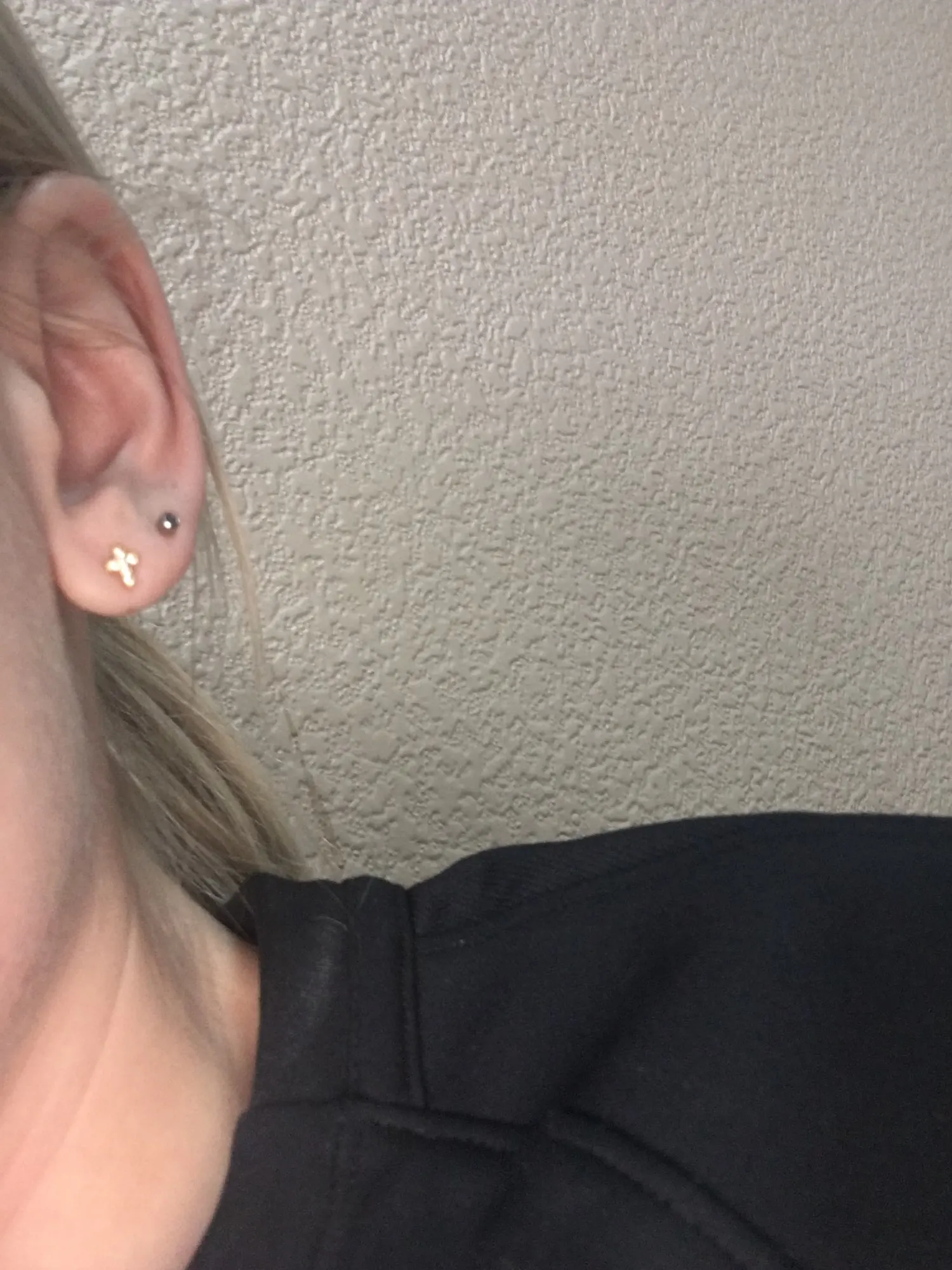 Малюююсенькие блестящие крестики, красивые, не броские, хорошо садятся на ухо выше мочки.