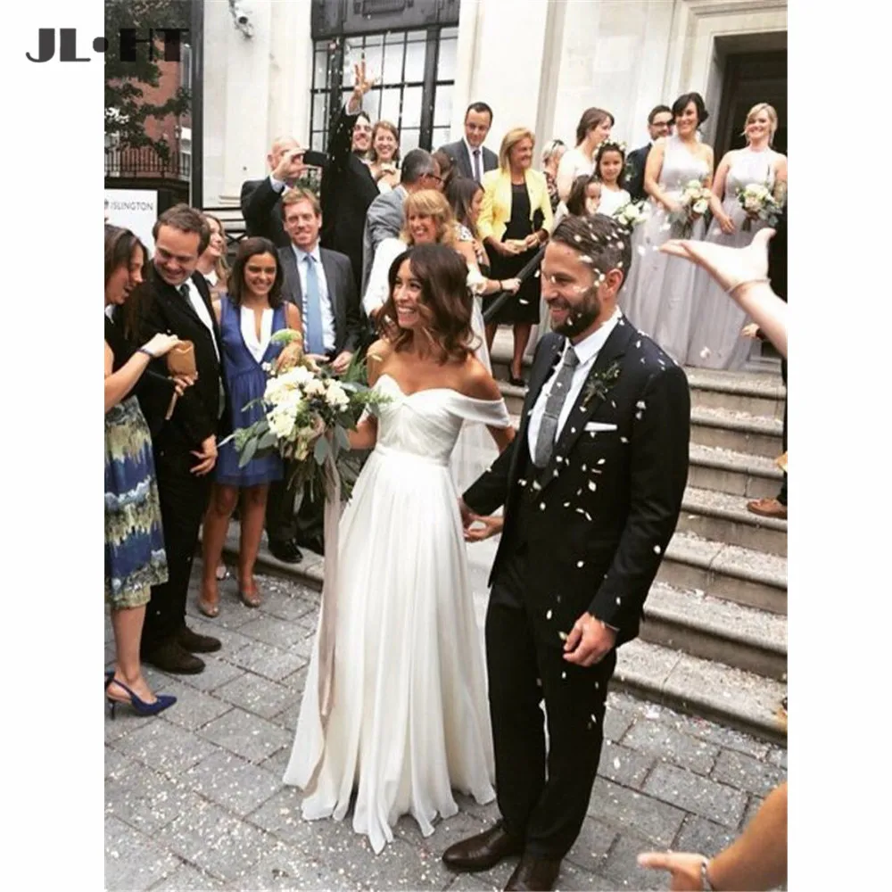 Пляжное свадебное платье в стиле бохо с открытыми плечами, шифоновое свадебное платье до пола с плиссировкой и коротким рукавом, свадебные платья