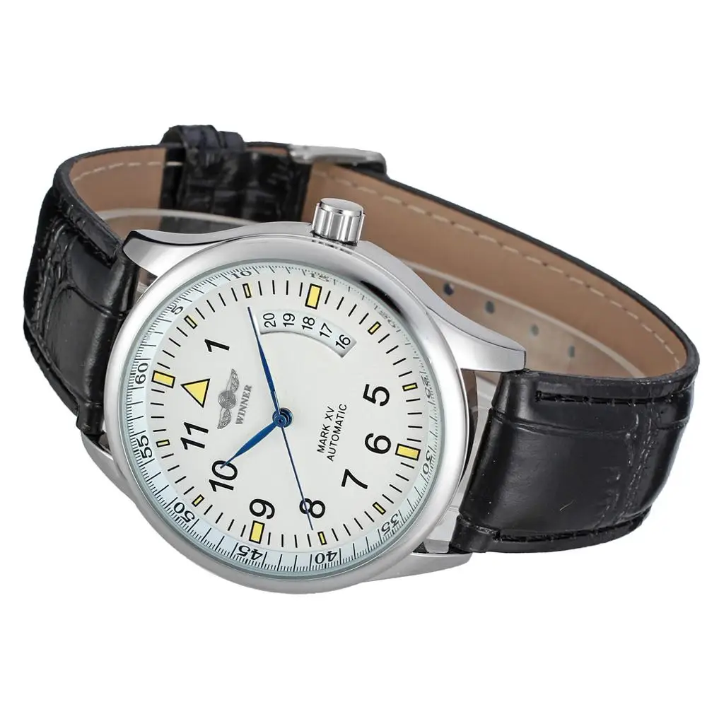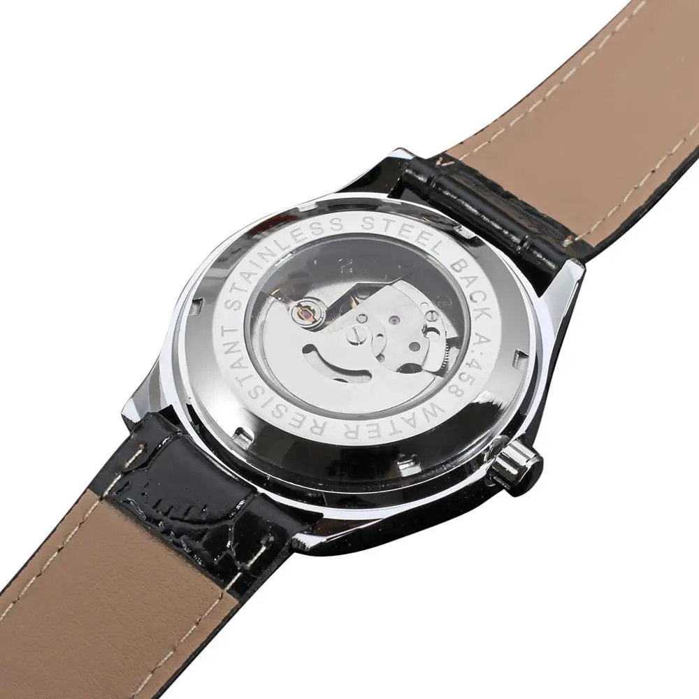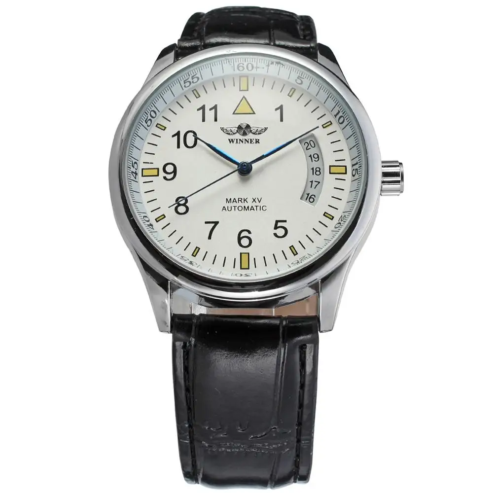 Часы мужские и женские WINNER, с календарем, циферблат белый, серебристый корпус, черный кожаный ремешок, автоматические механические часы