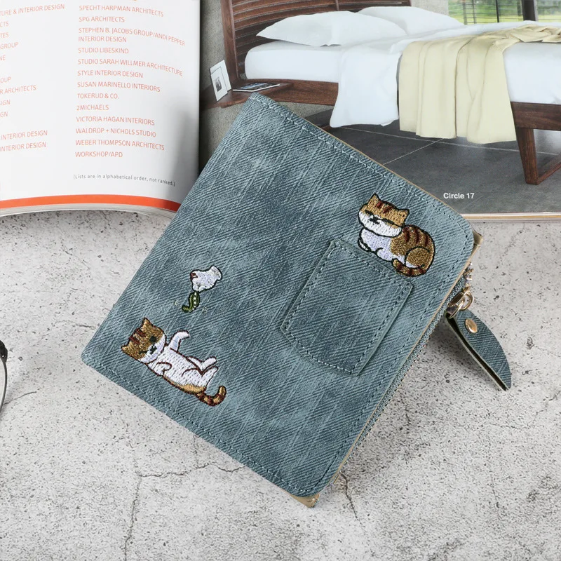 Женский короткий кошелек с вышивкой и котом, кошелек на молнии, короткий женский кошелек, милый мини-кошелек с держателем для карт, клатч для девушек, женские кошельки