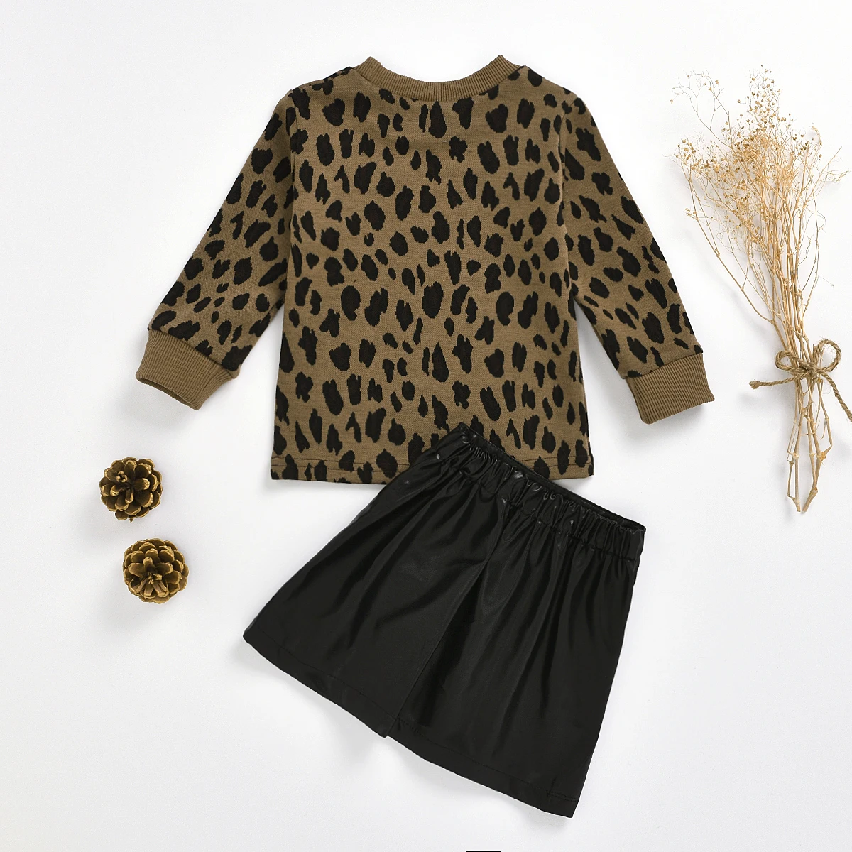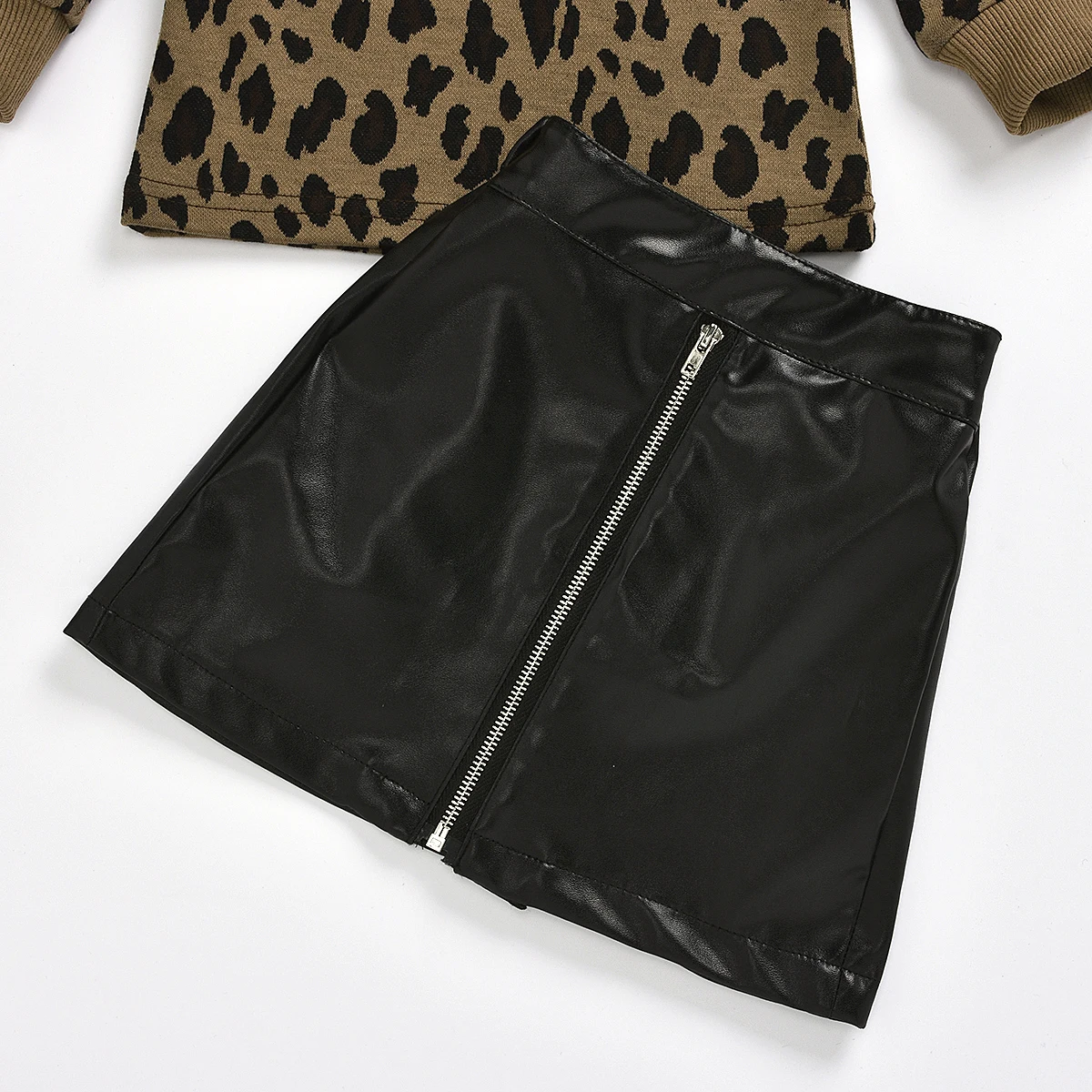 Комплект одежды для маленьких девочек из 2 предметов, пуловер с леопардовым принтом, кофта, Кожаная Мини-юбка, наряд для вечеринки, От 1 до 5 лет