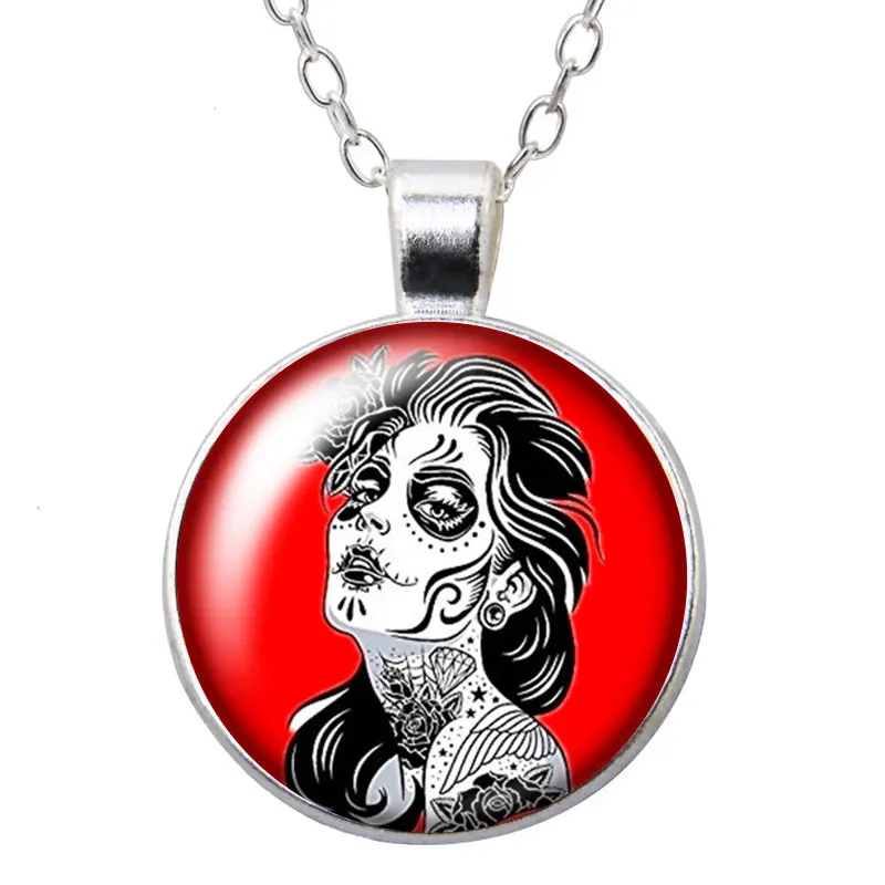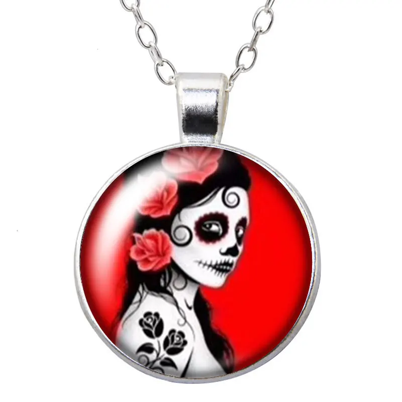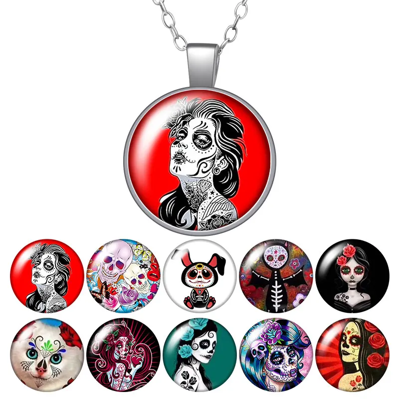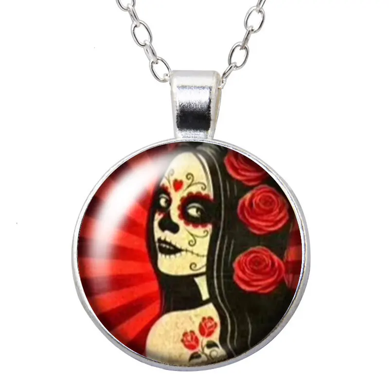 Женский Круглый Кулон в стиле панк, ожерелье с подвеской в виде черепа, розы, 25 мм, стеклянный кабошон серебристого цвета, Ювелирное Украшение для вечевечерние НКИ, дня рождения, 50 см