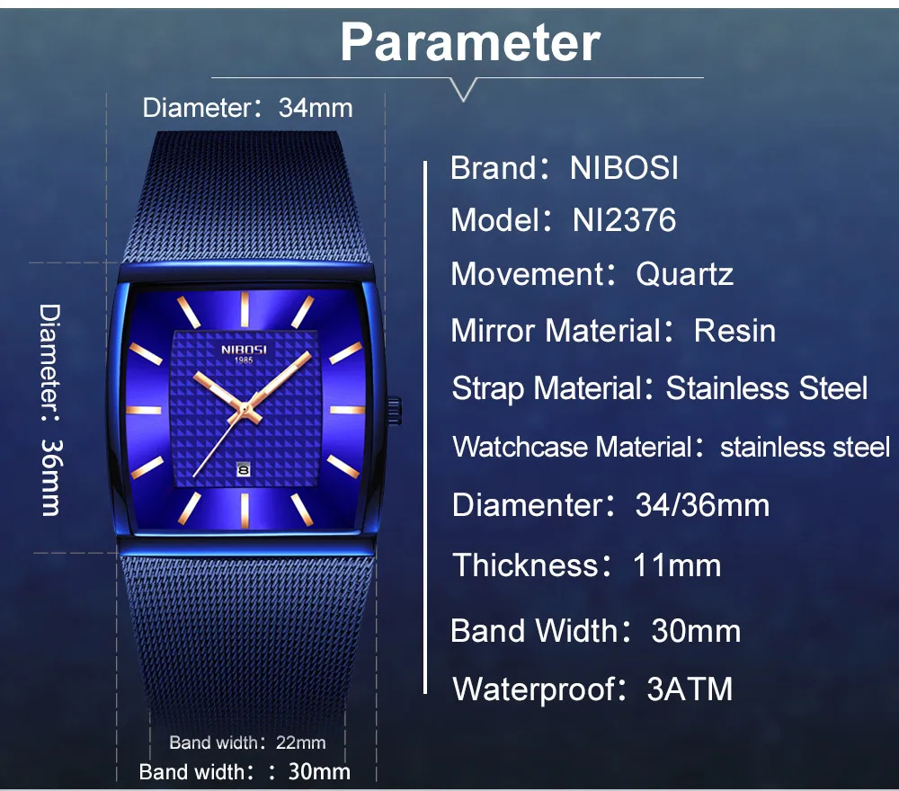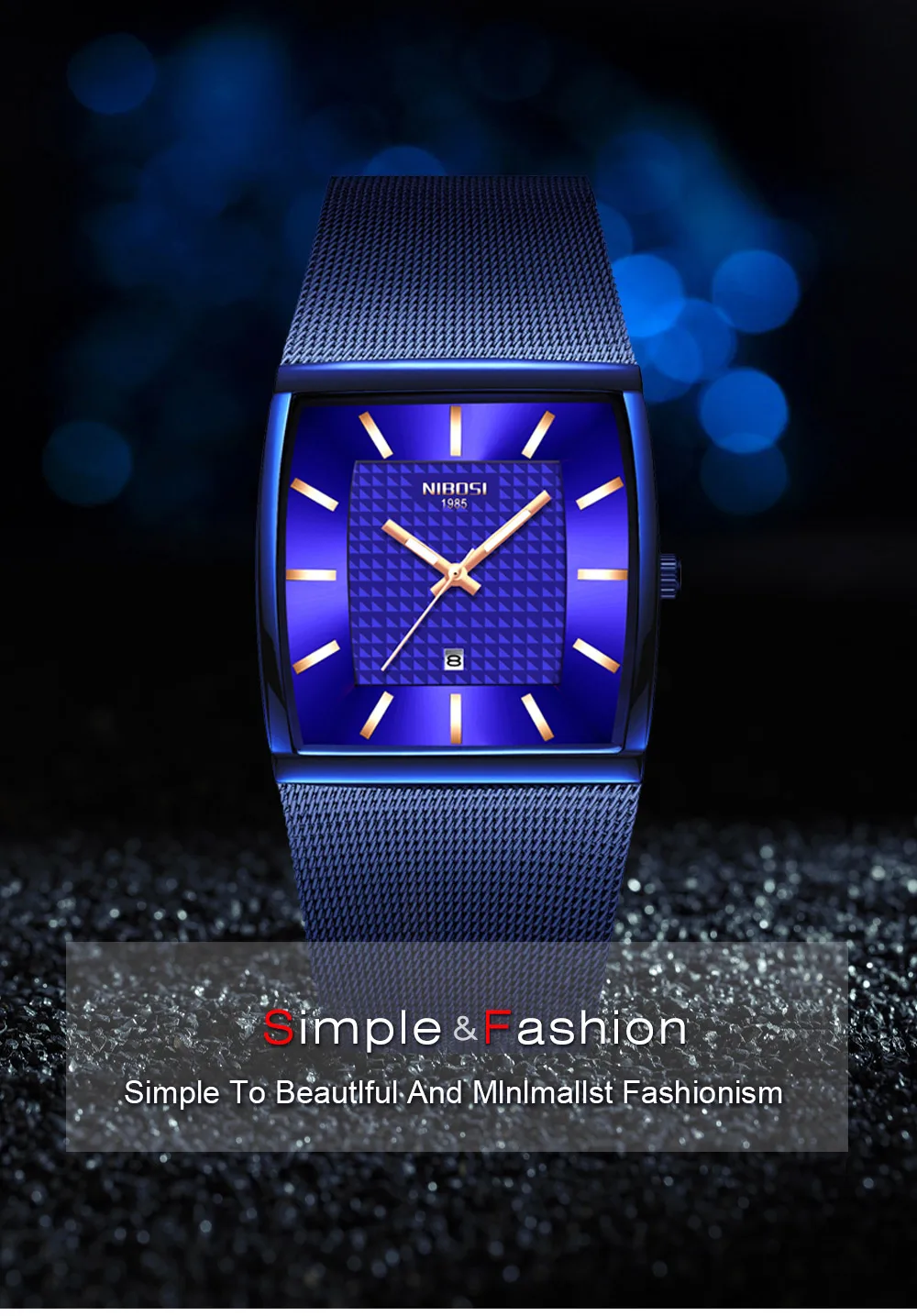 NIBOSI Мужские квадратные часы, 2019, роскошные брендовые водонепроницаемые кварцевые часы с синей сеткой, со стальным ремешком, мужские деловые часы