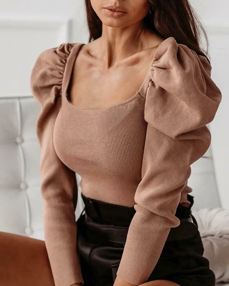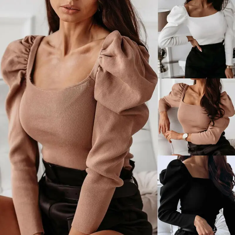 Модная женская повседневная трикотажная рубашка с пышными рукавами, Привлекательная блузка с длинным рукавом, тонкая женская объемная туника, уличная одежда