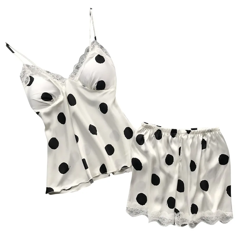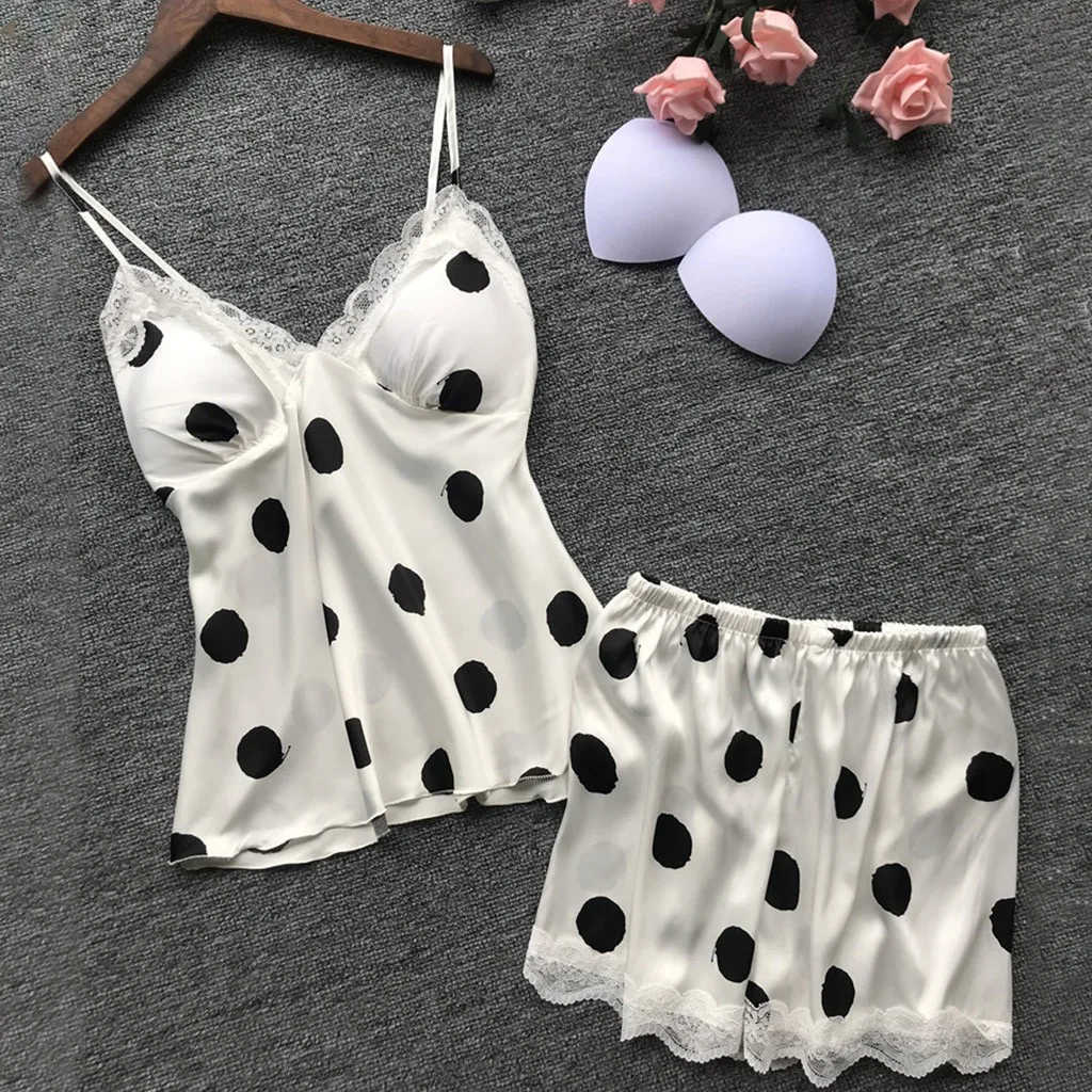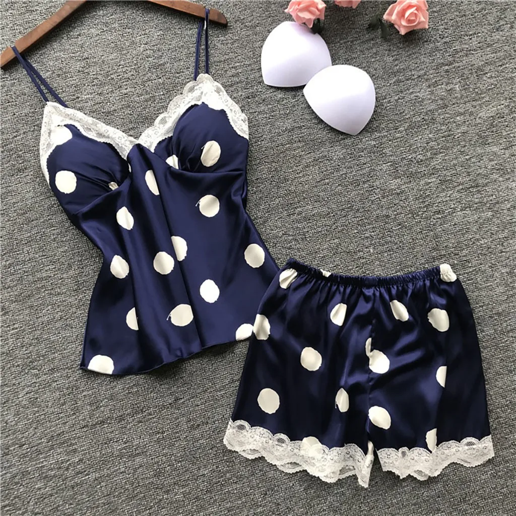 Лидер продаж, модная женская шелковая пижама, комплект милой пижамы в горошек Сексуальная атласная Женская пижама с кружевом, комплект с шортами, женское нижнее белье, женские пижамы