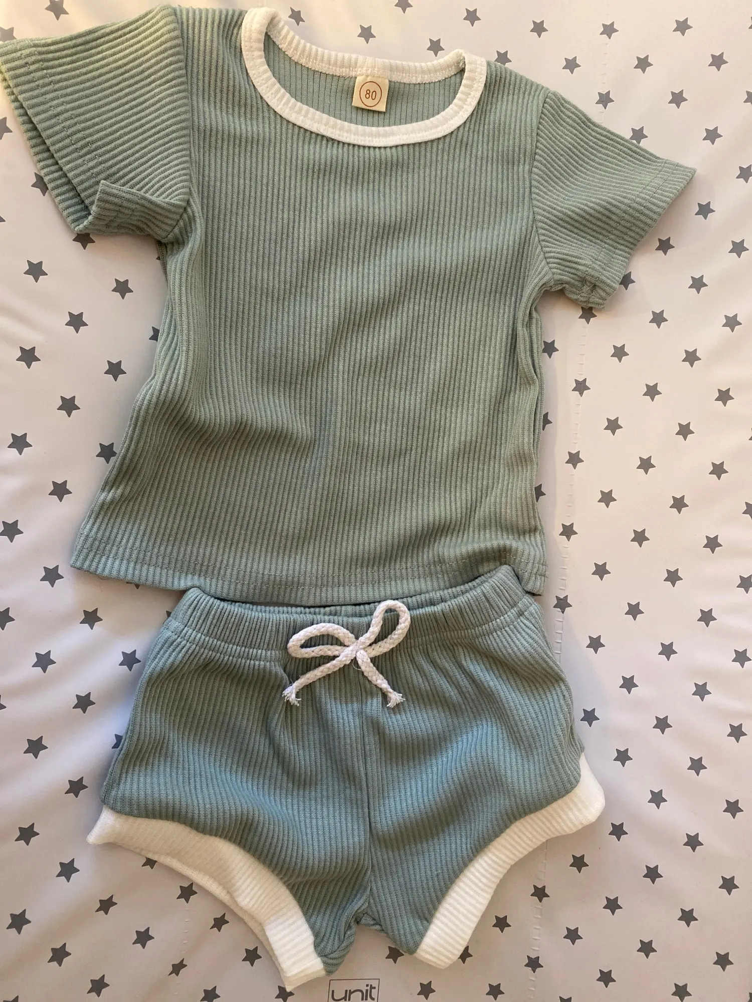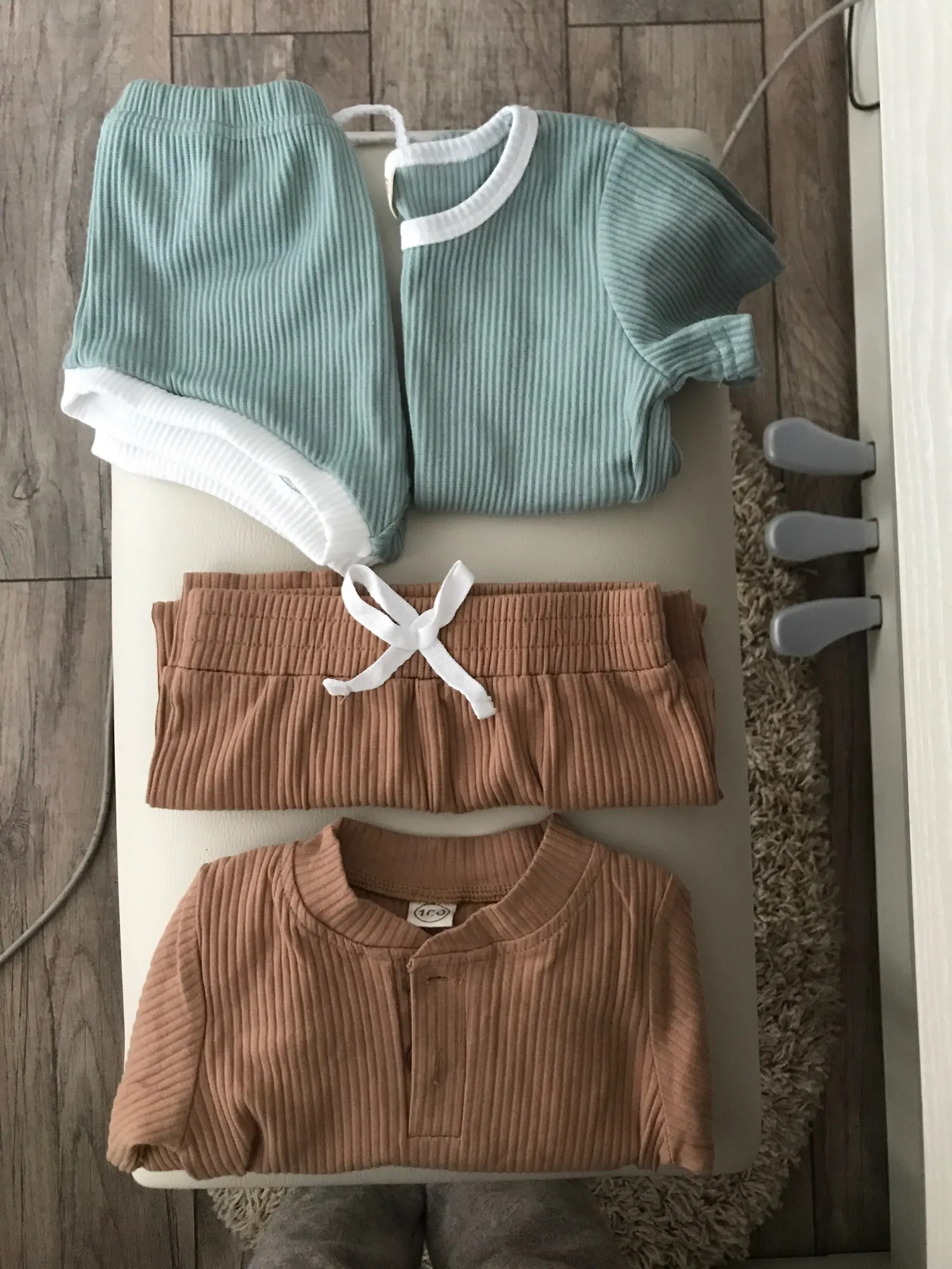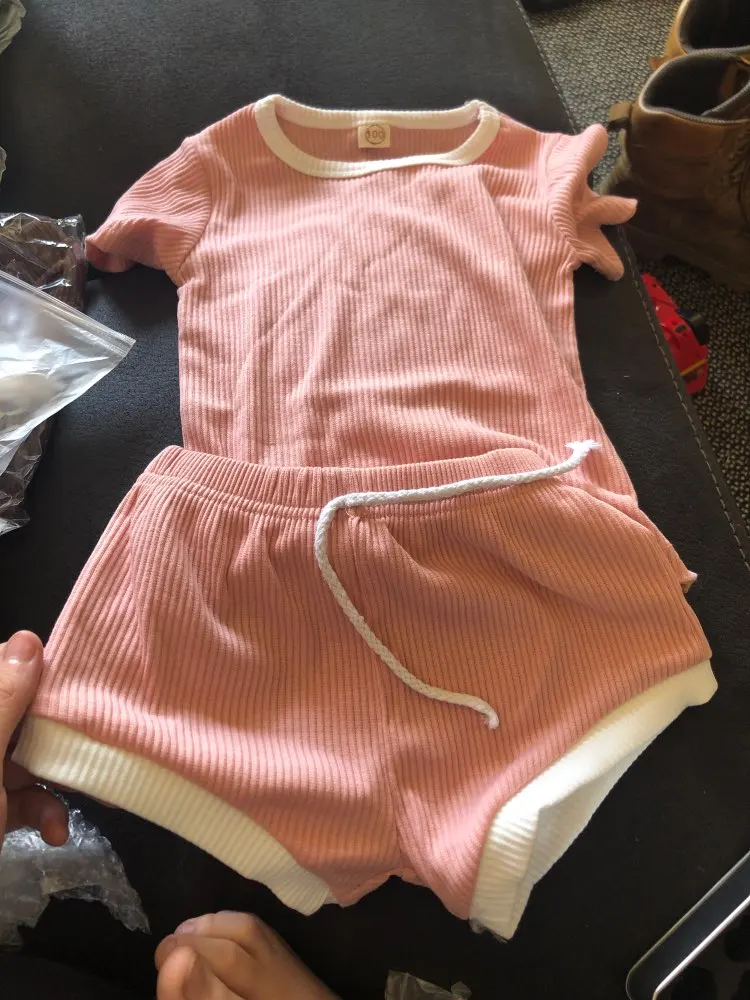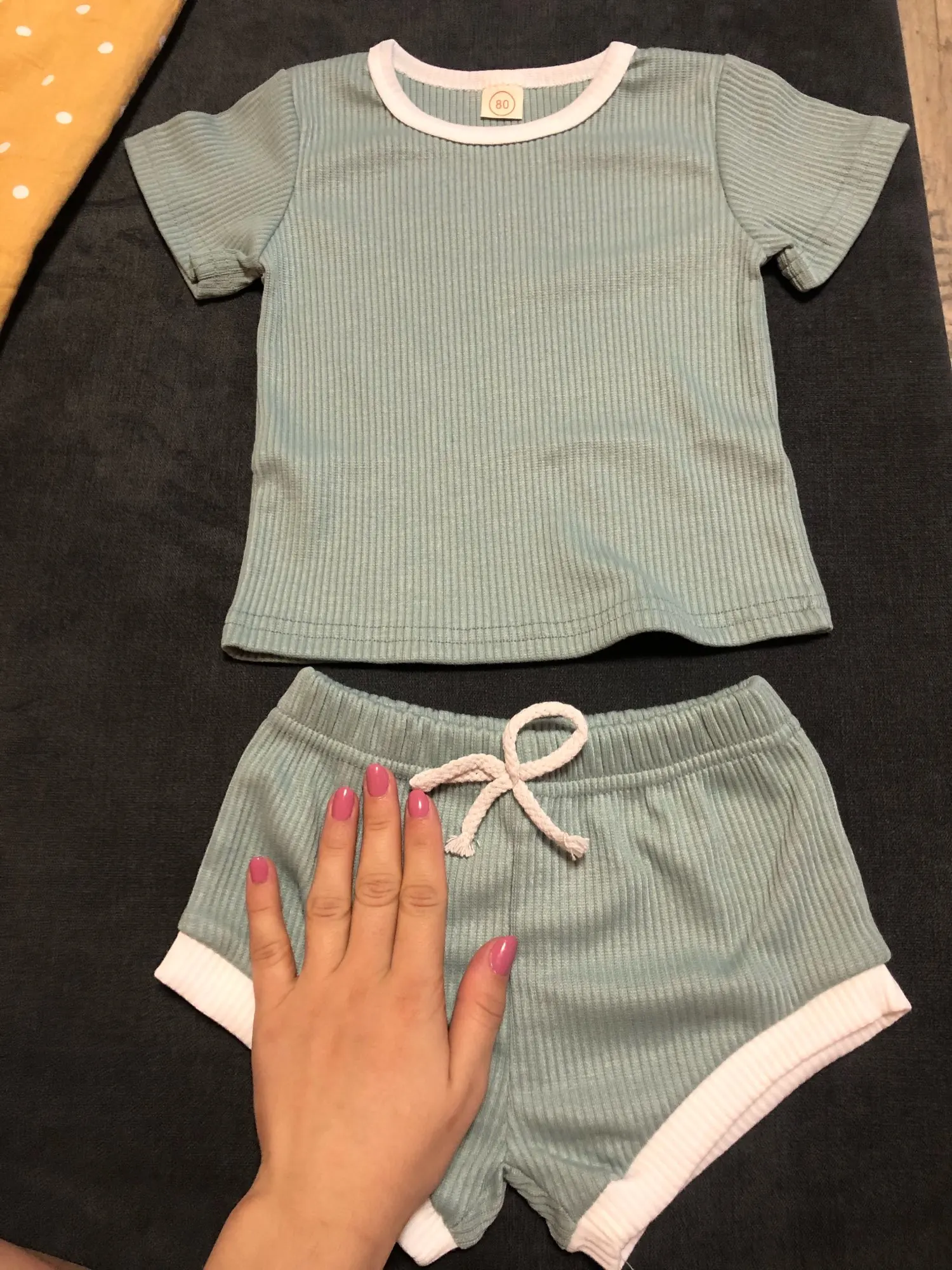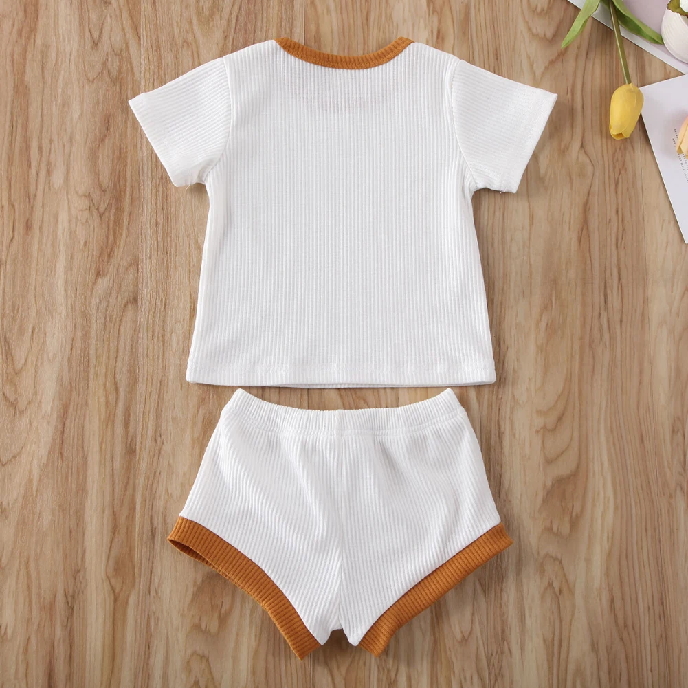 Детская летняя одежда, одежда для маленьких девочек и мальчиков, топы с короткими рукавами, футболка + шорты, штаны, однотонные ребристые наряды, 2020, От 0 до 3 лет