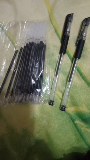 Обычные гелевые ручки. Пишут. Запасные стержни рабочие, закрыты защитными колпачками. Покупкой доволен.