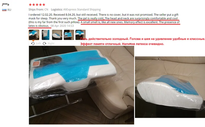 Подушки пришли быстро, до Ставрополя за 7 дней. Все как в описании, наволочка есть, плюс продавец отправил к каждой подушке по маске и ароматизатору. Сам продавец общительный, посылка отслеживалась, пришла на почту, подушки были свернуты в двое и упакованы в обычный черный пакет. Запах химии присутствует, но не критично. Муж даже не чувствует. Гель охлаждает . Попробуем, тогда напишу дополнительный отзыв.