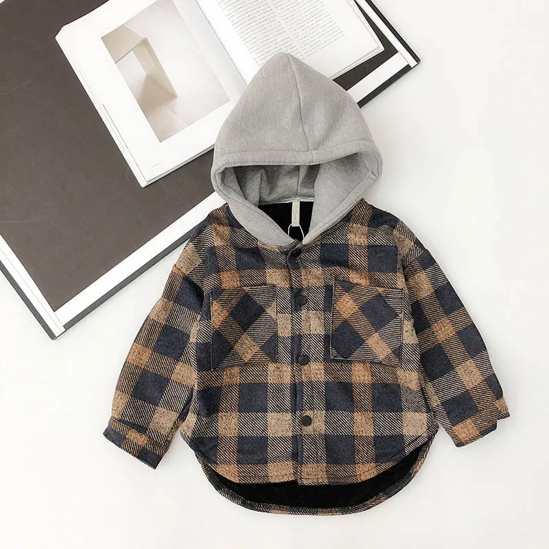 Зимняя Вельветовая Детская шерстяная куртка с капюшоном Повседневная Детские куртки для мальчиков в ретро-клетку теплая плотная рубашка для мальчиков верхняя одежда, 24 мес.-8 лет