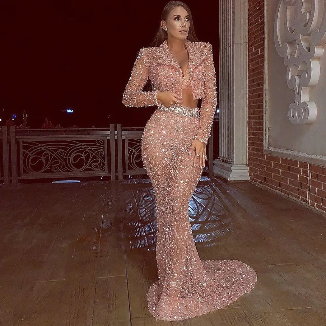 Женское вечернее платье с блестками, розовое Прозрачное платье-футляр с длинным рукавом, длинное платье для выпускного вечера и вечерние, из двух предметов