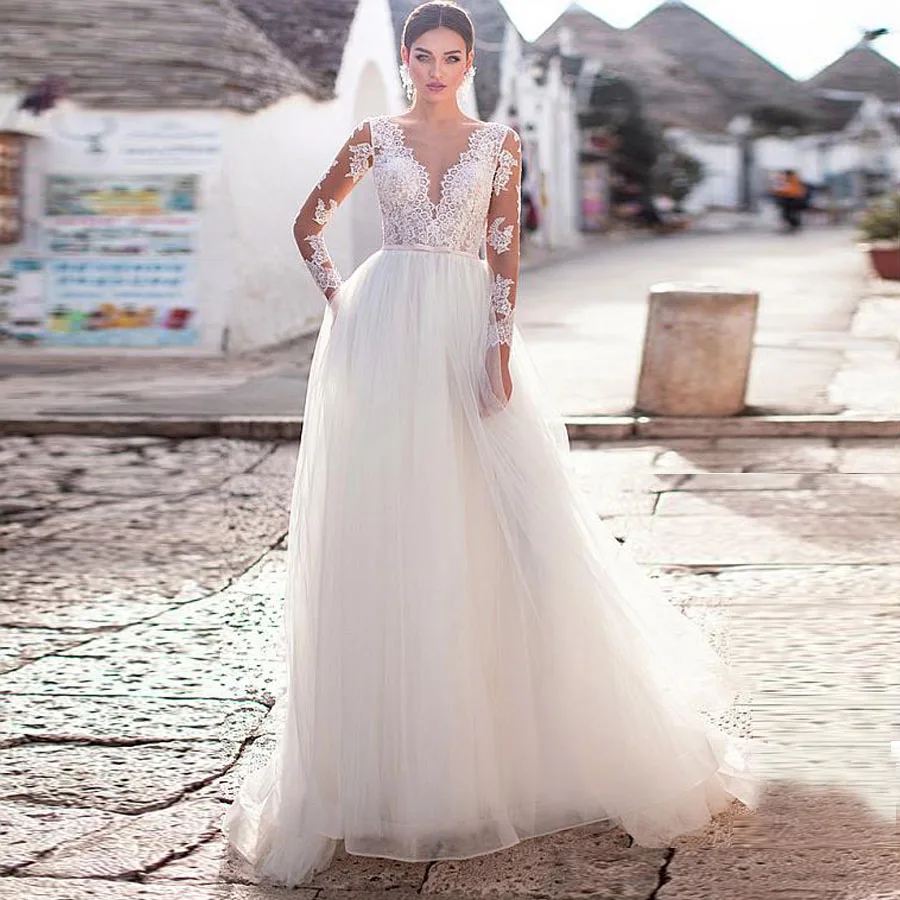 Платье Свадебное ТРАПЕЦИЕВИДНОЕ с круглым вырезом, длинным рукавом и аппликацией