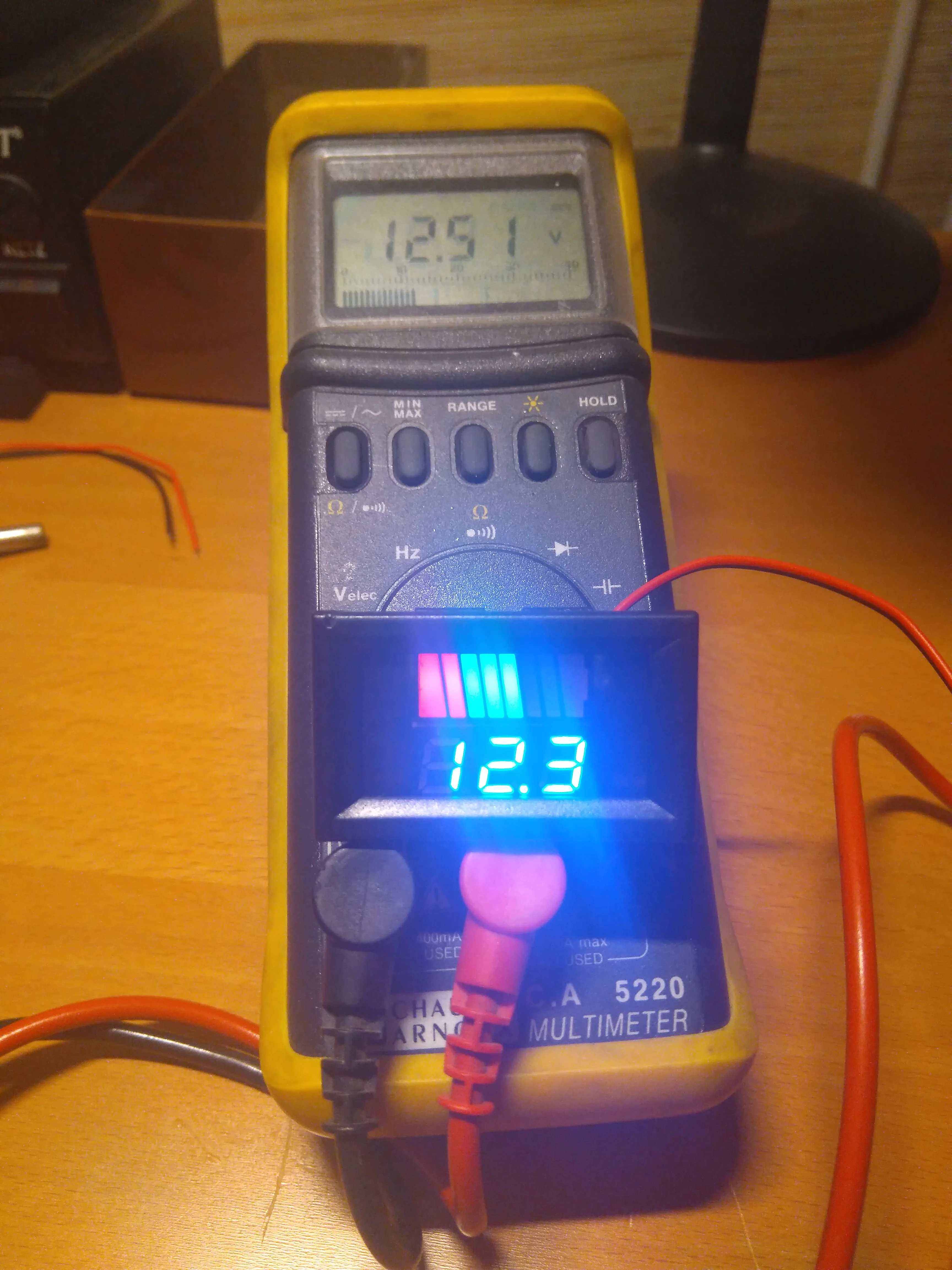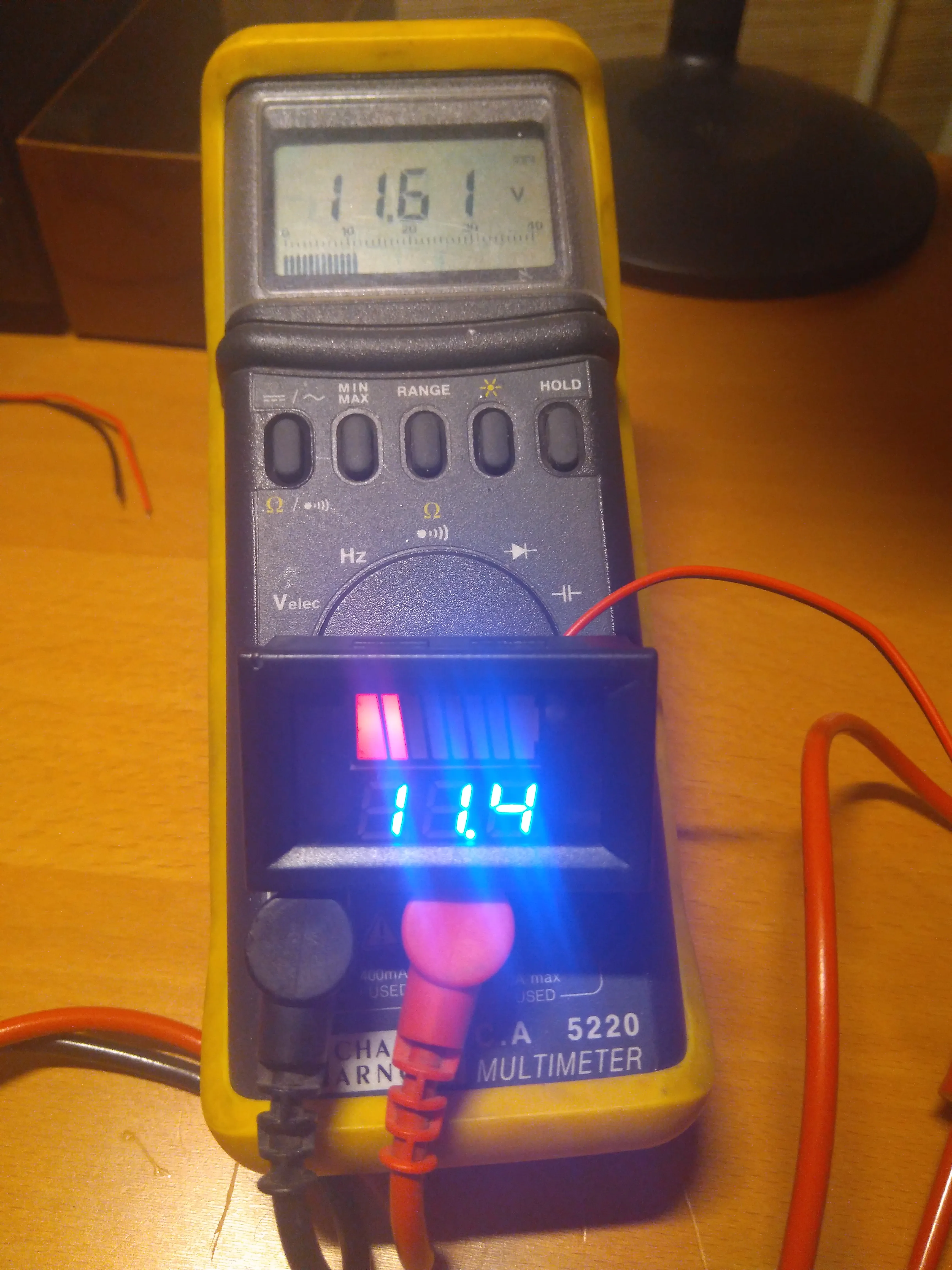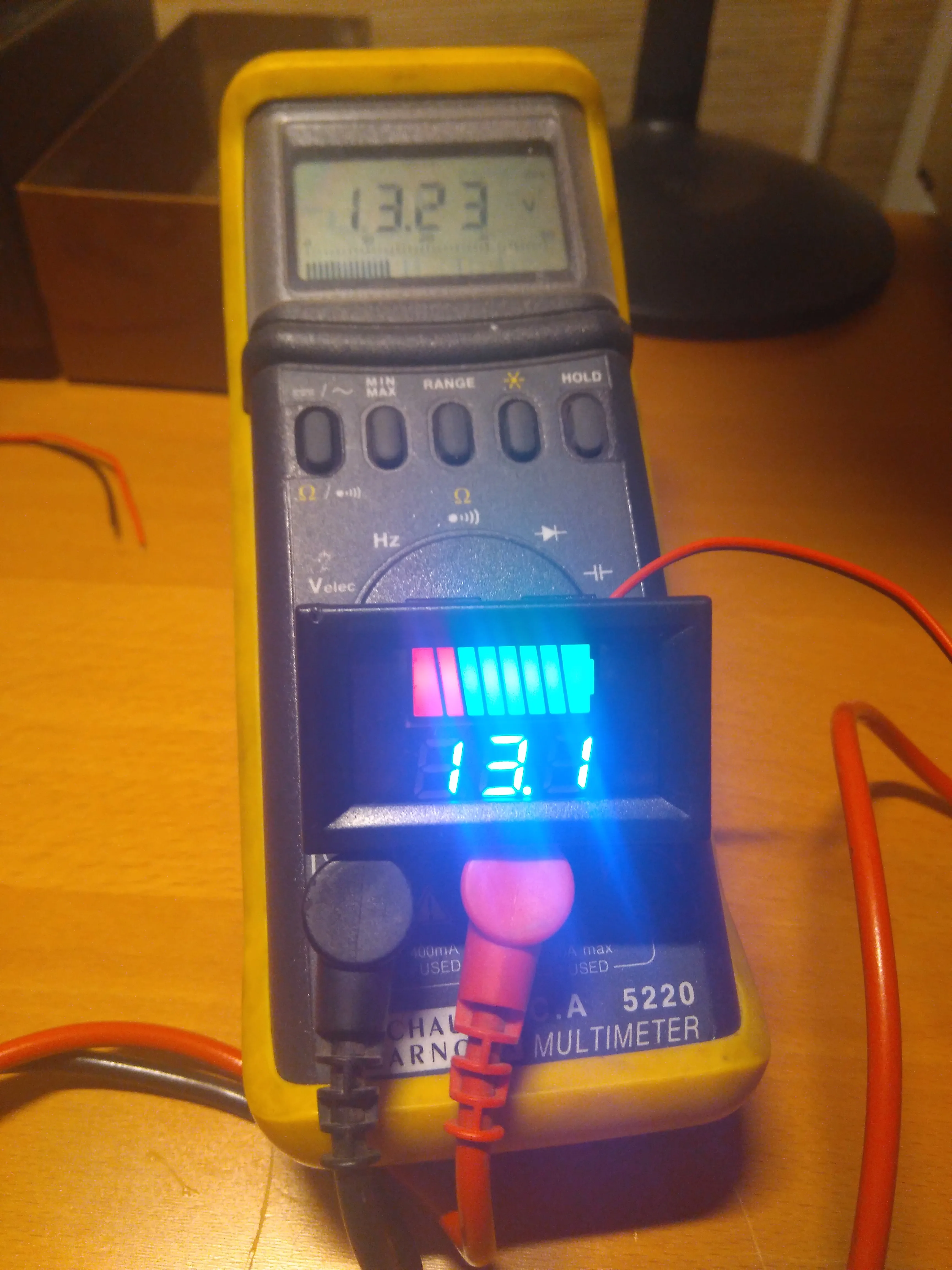 Разница между отображаемым значением напряжения (слегка пессимистично) и значением калиброванного мультиметра остается менее 200 мВ на диапазоне измерений. Датчик сварных соединительных проводов на CI слишком слаб на мой вкус (хрупкость). Для улучшения.