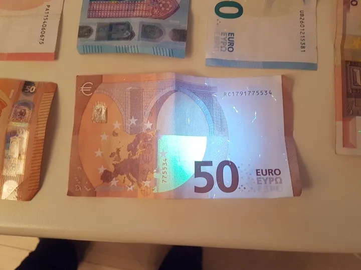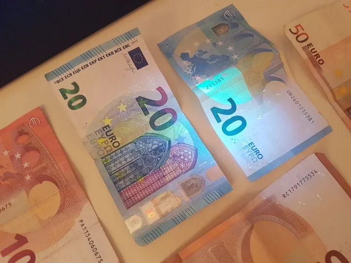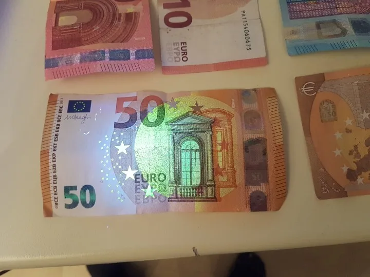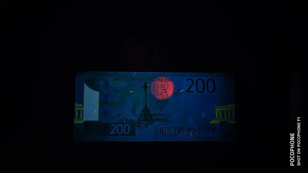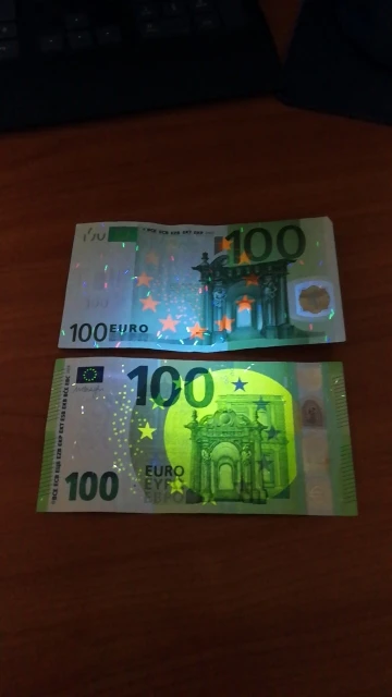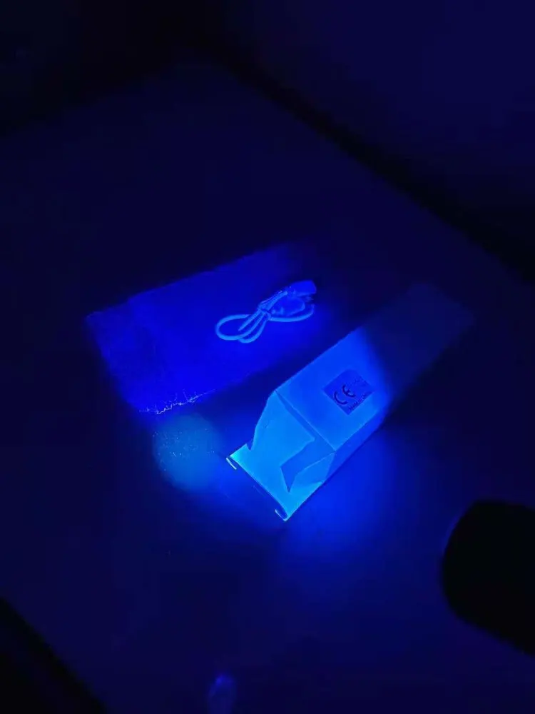 Фонарь мне понравился. Прочный корпус, мощный светодиод, отражатель фокусирует луч в небольшую точку, светофильтр (чёрное стекло) пропускает только ультрафиолет и потому нет паразитной засветки объекта видимым светом от фонаря. Длина волны соответствует указанной на корпусе. Под лучом УФ ярко светятся многие пластмассы, ткани, бумага. На фото видно, как светятся все степени защиты денег и лист белой бумаги, подложенный снизу. Мощности фонаря достаточно, например, чтобы заметить даже при неярком дневном свете свечение защитных элементов денег.