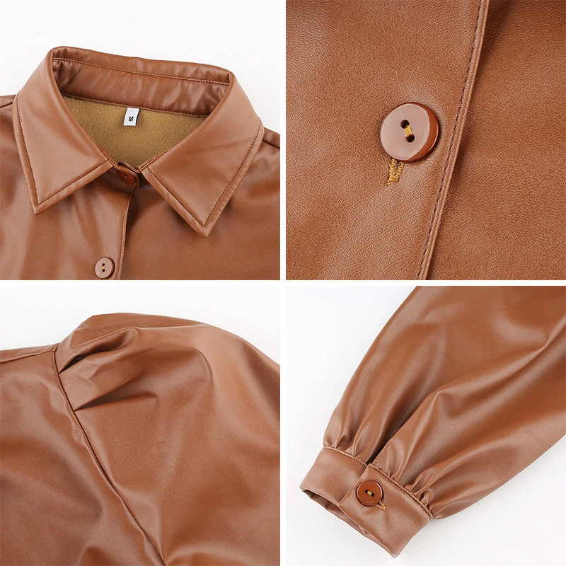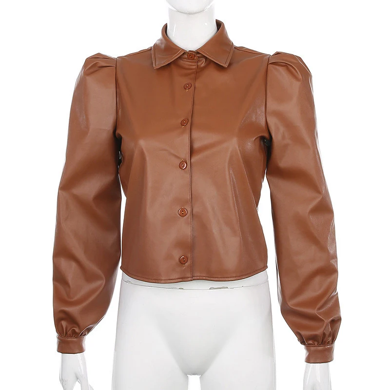 Новинка, женская рубашка с длинными рукавами-фонариками и отложным воротником, на пуговицах, из искусственной кожи, элегантная модная осенне-зимняя повседневная коричневая блузка, топы