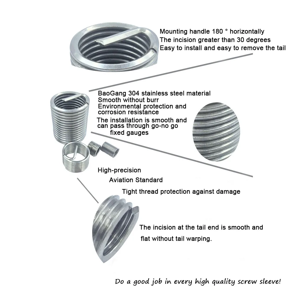Втулка для винтового типа может зафиксировать винт в резьбовом отверстии, чтобы винт не болтался При ударной вибрации. Из-за определенной эластичности, может сделать нагрузку на резьбу более равномерной, устранить отклонение между винтами и отверстиями для винтов между шагом и типами Зубцов, а также может поглощать вибрацию, таким образом, увеличивается прочность соединения винтовой резьбы и устойчивость к усталостной прочности. Избегайте скольжения провода, неправильных зубцов и получите отличную производительность подключения. Не ослабляется. Особенно для самолетов и других продуктов, требующих высоких страховых коэффициентов. Продлевает срок службы нити. Высокая прочность и твердость. Удобно и практично. Прочный в использовании. Износостойкий. Используется для частой разборки, это может значительно продлить срок службы нити. Легко поддерживать. Вставку с проволочной резьбой можно использовать в качестве инструмента для эффективного ремонта отверстий с резьбой. Поврежденные отверстия для винтов помещаются в втулку для винтов, что позволяет использовать повторно, чтобы избежать повреждения заготовки. Все аксессуары упакованы в коробку для удобства переноски и хранения