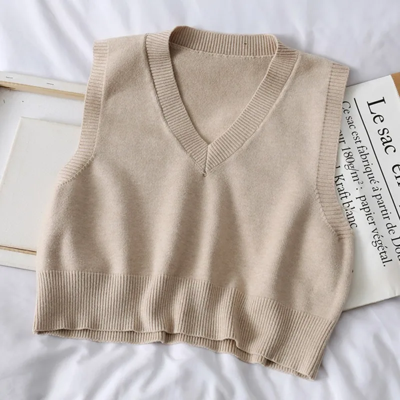 Осенний свитер без рукавов, женский милый однотонный вязаный свитер с V-образным вырезом, свободный, приталенный, свитера-жилеты